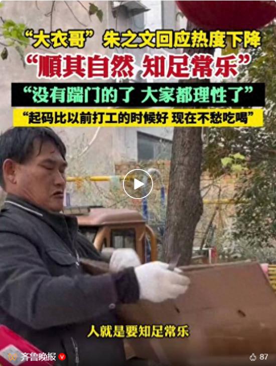 10月31日消息,来自山东菏泽的农民歌手“大衣哥”朱之文回应自己用何种心态面对“热度下降”时说,顺其自然,人要知足常乐。“最起码比以前干建筑打工要强。现在不愁吃穿,有公益的活动找我我分文不取。”