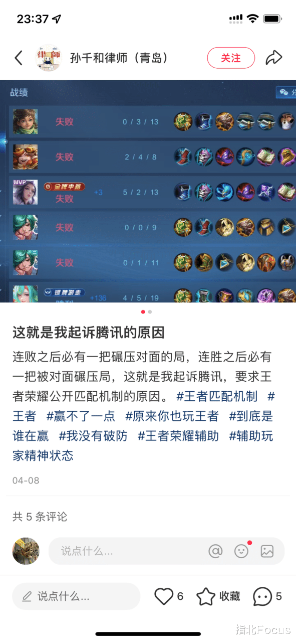 但孙千和律师似乎正好运用了大家玩输了后的心情,心塞、愤慨,无处排解。所以这个时候,孙律师的一连串情绪表达能引起共鸣,比如“为什么连胜之后必连败?”“千里之外,我是如何匹配到那个大坑货的?”“星耀玩家为什么会匹配到国标对手?”等等