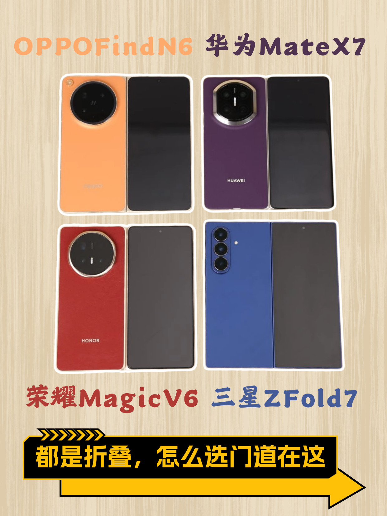 手感:三星 Z Fold7 确实轻,215g 合上像直板机,8.9mm 薄,放口袋无压力\华为 Mate X7 背面云锦纹很高级,但 236g 略重,拿久了手会酸\荣耀 Magic V6 也属于轻巧型,OPPO Find N6 厚度控制得很好,握持感舒服