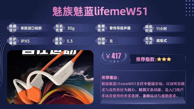 魅族魅蓝lifemeW51面向中低端市场,以开放、沉浸双听音模式为特色,适配多场景使用,性价比与实用性兼备。