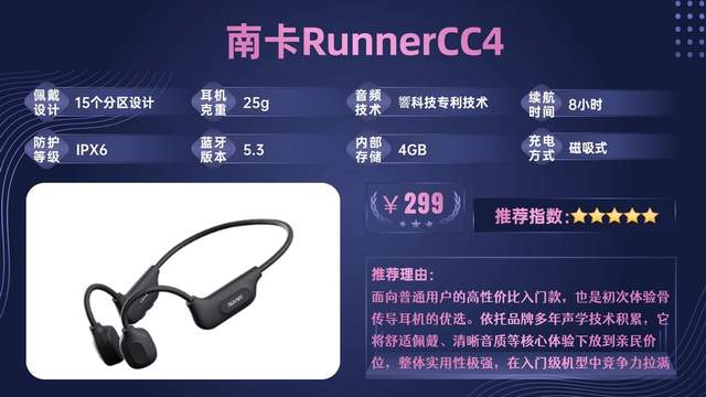 南卡RunnerCC4主打均衡全面的使用体验,品牌将成熟骨传导技术运用到百元机型,在佩戴舒适度、音质与实用性间做到极佳平衡,是适配全场景的入门爆款骨传导耳机。