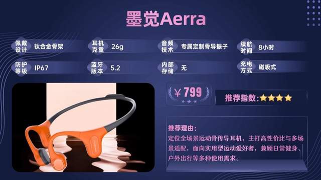 墨觉Aerra定位全场景运动骨传导耳机,主打高性价比与多场景适配,面向实用型运动爱好者,兼顾日常健身、户外出行等多种使用需求。
