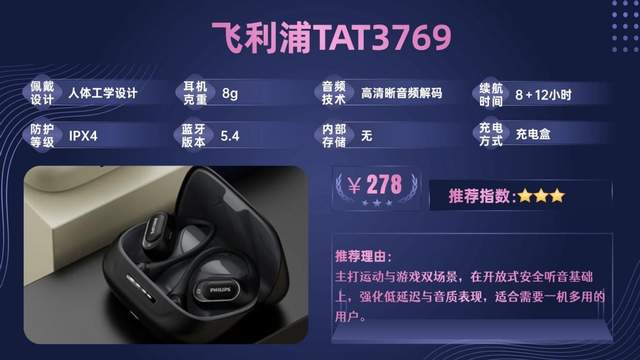 飞利浦TAT3769主打运动与游戏双场景,在开放式安全听音基础上,强化低延迟与音质表现,适合需要一机多用的用户。