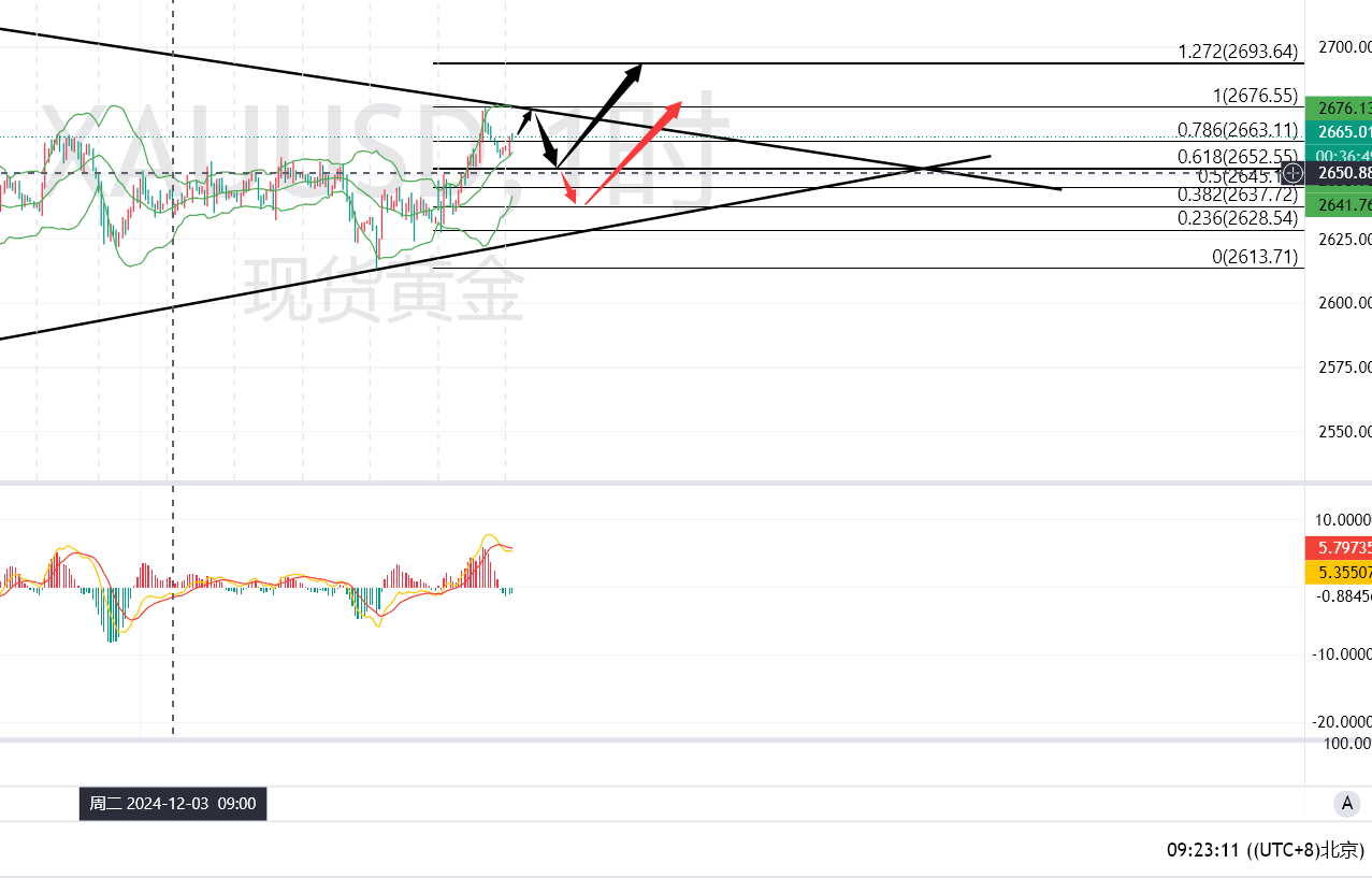 从黄金的1小时级别图表分析来看,金价整体呈现收敛三角形的整理形态,价格波动幅度逐渐收窄。若后续金价成功突破上方的趋势线,则预示着上涨行情的延续。当前,金价在2656点位获得支撑并出现反弹,值得注意的是,2656点位曾是前期波段的高点,此番反弹可视为新上升趋势中的上升阶段,预示着金价后续将具备上涨的动力。观察MACD指标,快慢线在零轴上方的高位形成死叉后,呈现出向金叉转化的趋势。同时,空头动能柱持续缩减,这进一步表明了金价后续上涨的潜力。