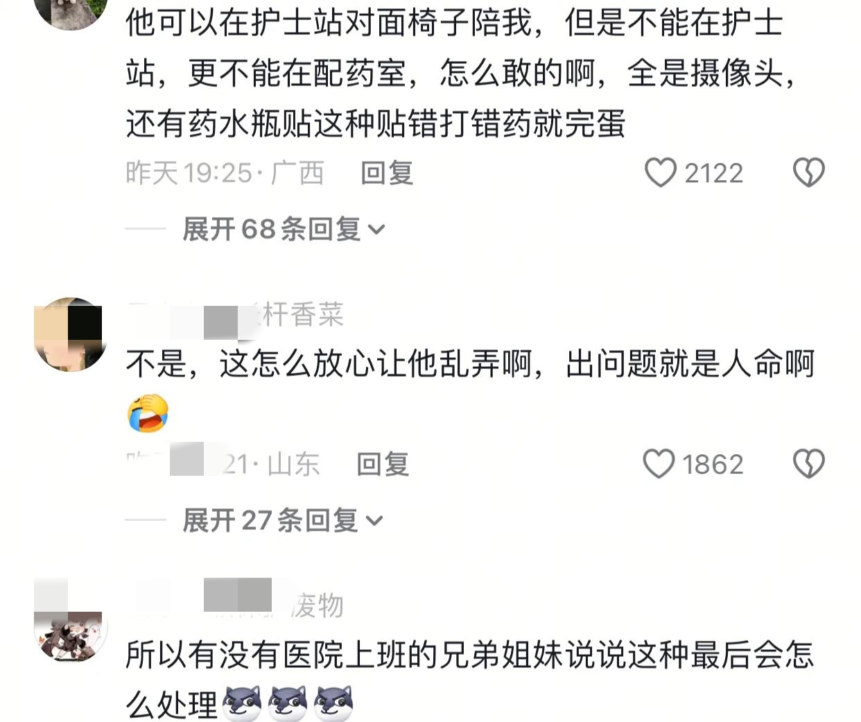 帮着搬药品、在护士站揉肩捶背,更令人心惊的是,这个毫无医疗资质的外人,竟然直接进入配药室,熟练地帮忙粘贴药品标签、对着电脑撰写护理报告,俨然编外医护人员