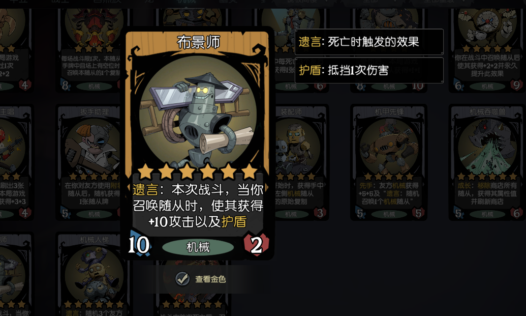 布景师这张卡也是超强的辅助,效果是遗言:本次战斗,当你召唤随从时,使其获得+5攻击以及护盾,只要它先触发遗言,你这次战斗所有召唤出的随从都自带护盾,非常强,相当于直接将战斗力翻倍了。