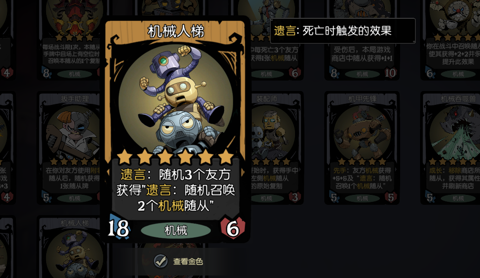 剩下的几张就都是S8的新卡了,机械人梯是这套阵容的核心,它的效果是遗言:随机3个友方获得”遗言:随机召唤1个机械随从",以前我们玩红茶还要找一些其他的遗言随从,有了这个就省去了很多麻烦,金色之后是随机召唤2个,保证了召唤随从的数量,省下了场上的格子。