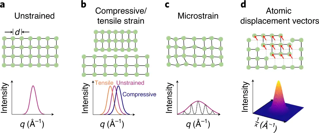 。通过XRD图谱的峰位偏移、宽化和分裂可用于定量分析晶格畸变,为材料研究提供重要工具。