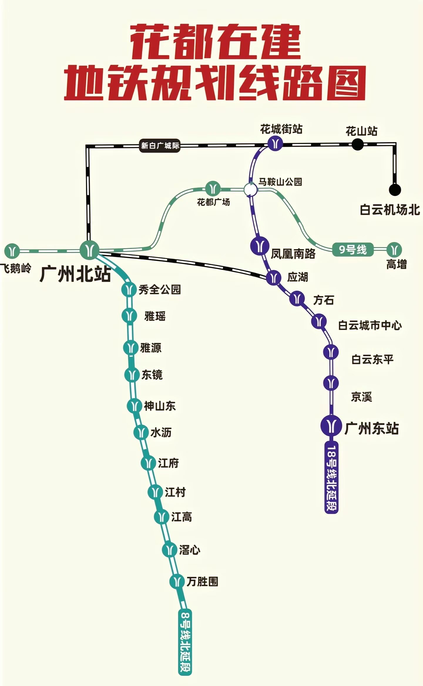 值得期待的是八号线北延线及其支线,18号线北延线,22北延线都在施工,未来从花都区政区到广州中心城区最快30分钟可达。