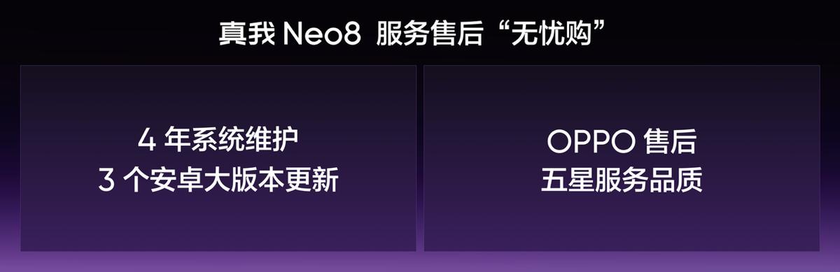 服务方面,真我Neo8承诺4年系统维护与3个安卓大版本更新。2026年4月接入OPPO售后体系后,用户可享受面对面维修、可视化寄修、30天性能故障包换等服务。