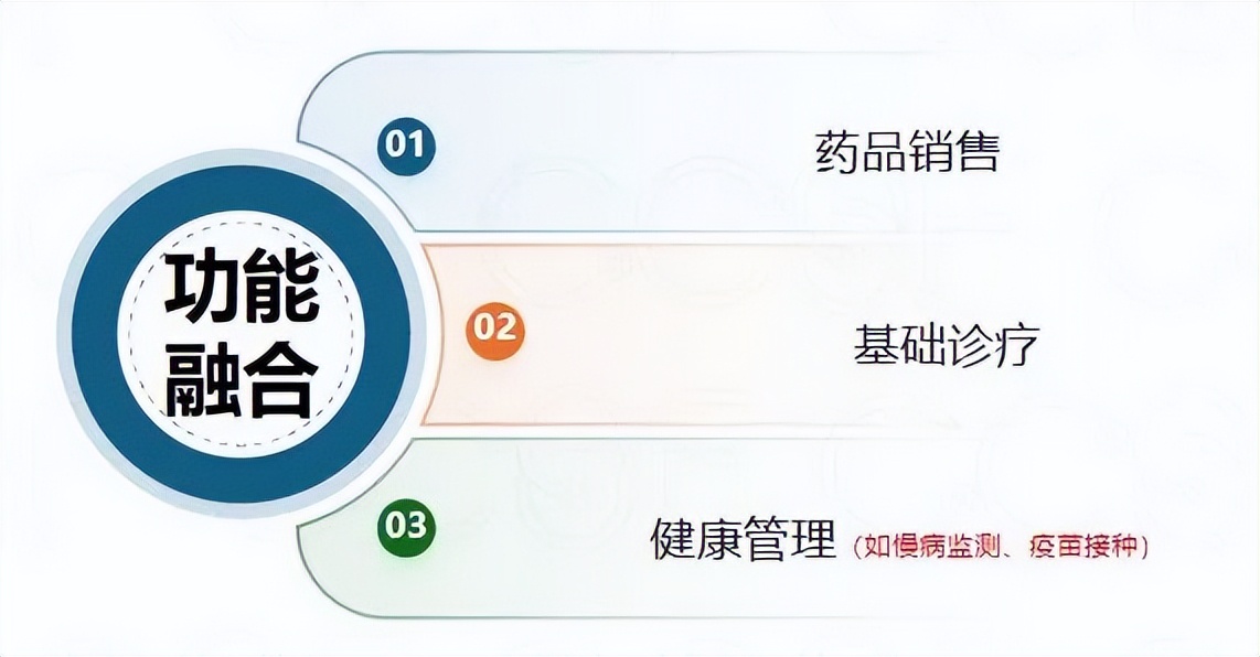它以药店为载体,嵌入诊所功能,提供药品销售、诊疗服务以及健康管理一体化的解决方案。其核心特征在于将问诊、开方、配药、随访四个环节形成完美闭环,成为基层医疗服务的“网底”。除了卖药,还兼具诊疗和健康管理功能,服务对象延展至“已病”和“未病”人群。