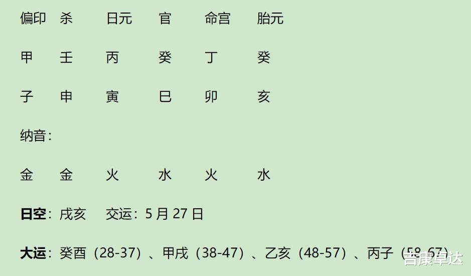 丙子运(1658-1667),丙比透,子与日支寅夹丑;杀制比,子丑申杀局,一般之运。