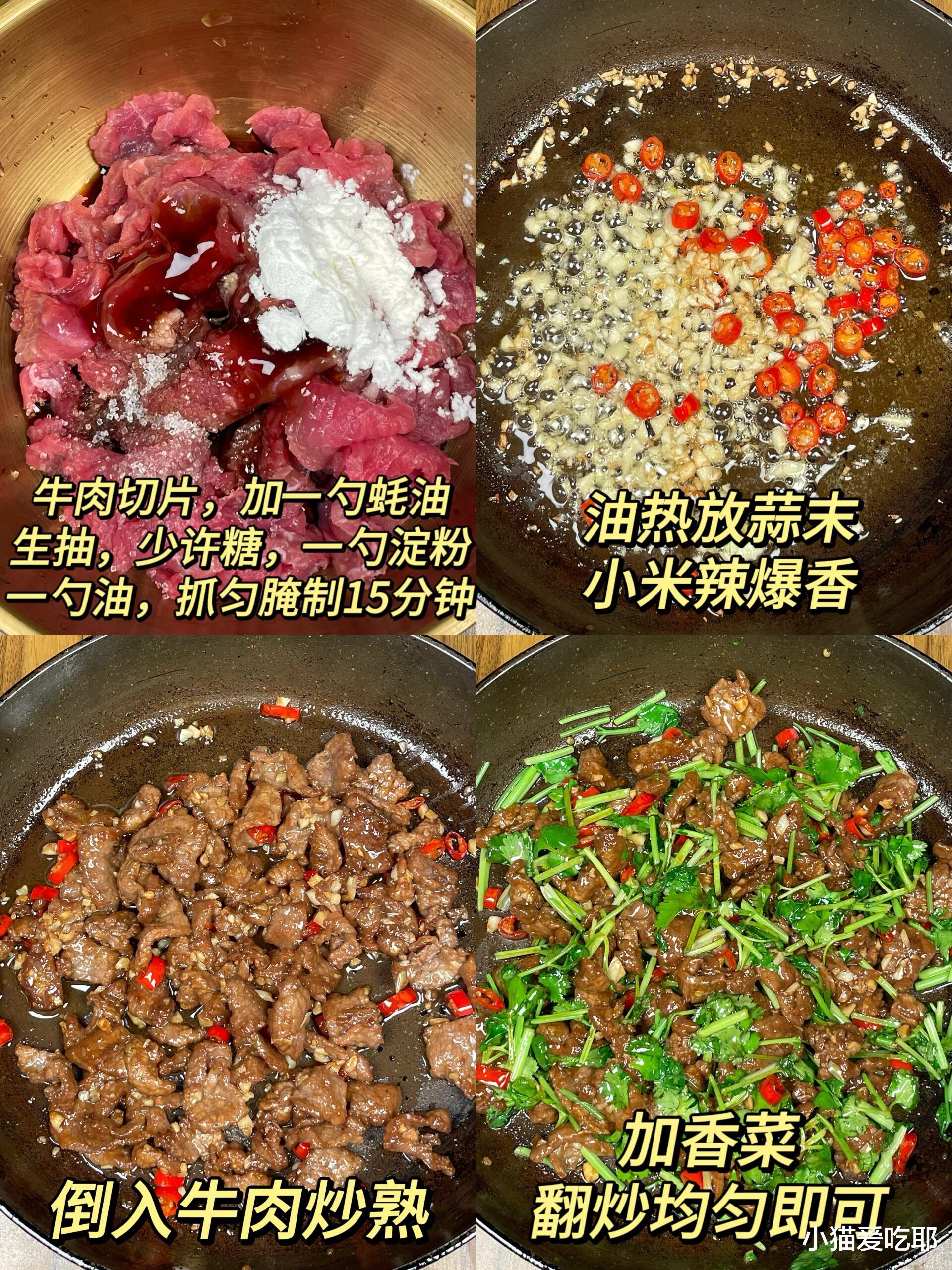然后,开始炒制。锅中加入适量的油,油热后,将腌制好的牛肉倒入锅中,快速翻炒。牛肉很容易熟,所以不要炒太久,大约1 - 2分钟,牛肉变色后就可以盛出备用。锅中留底油,放入干辣椒和蒜末,小火煸炒出香味。然后,将炒好的牛肉倒回锅中,加入适量的生抽、盐和糖,快速翻炒均匀,让牛肉充分吸收调料的味道。最后,加入切好的香菜段,大火快速翻炒几下,让香菜的香味充分释放出来,就可以出锅装盘了。