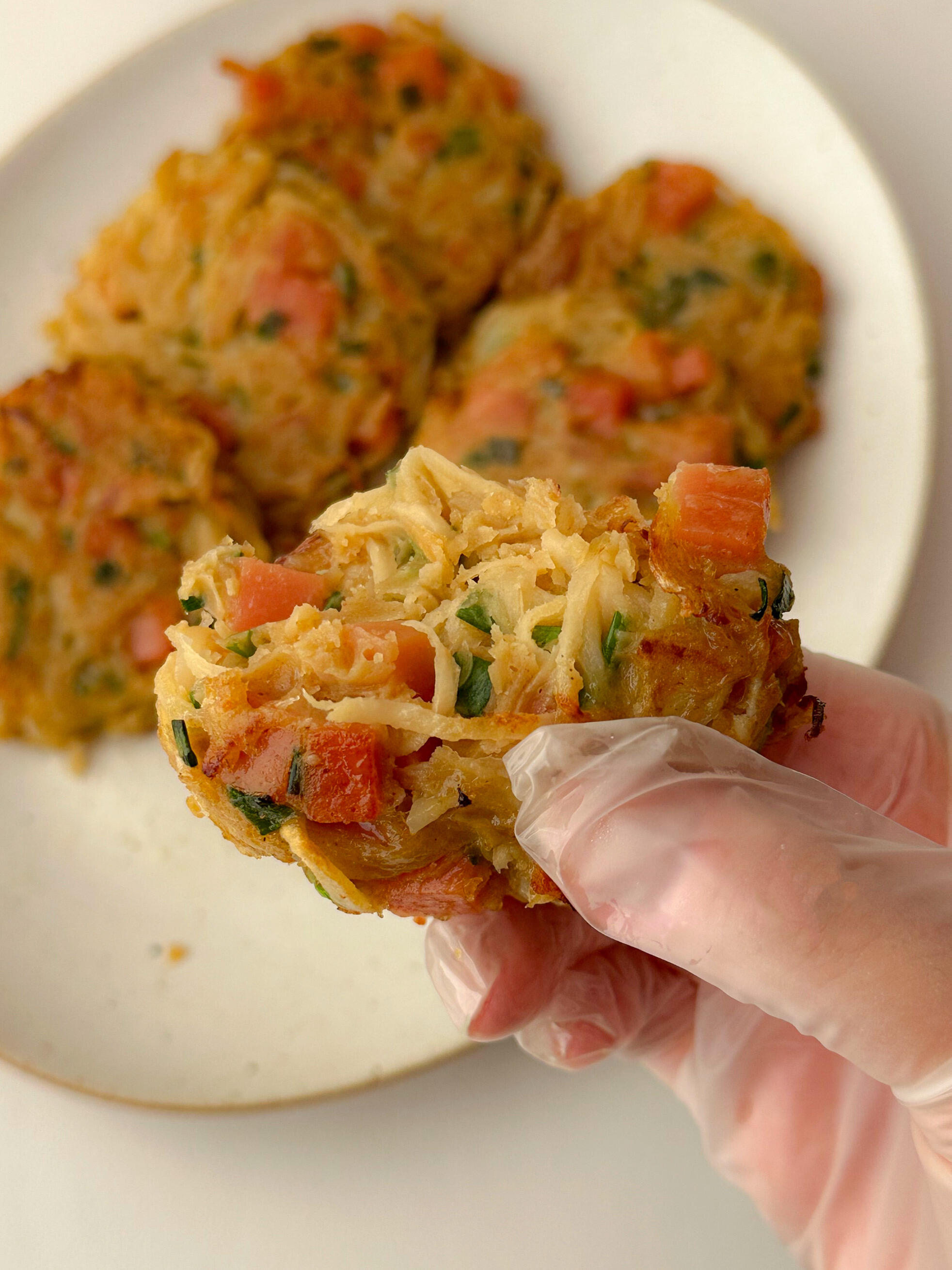 3. 煎好的小饼放在厨房纸上吸掉多余油分(这样吃起来不腻,外脆里软刚刚好),然后装盘,趁热吃!