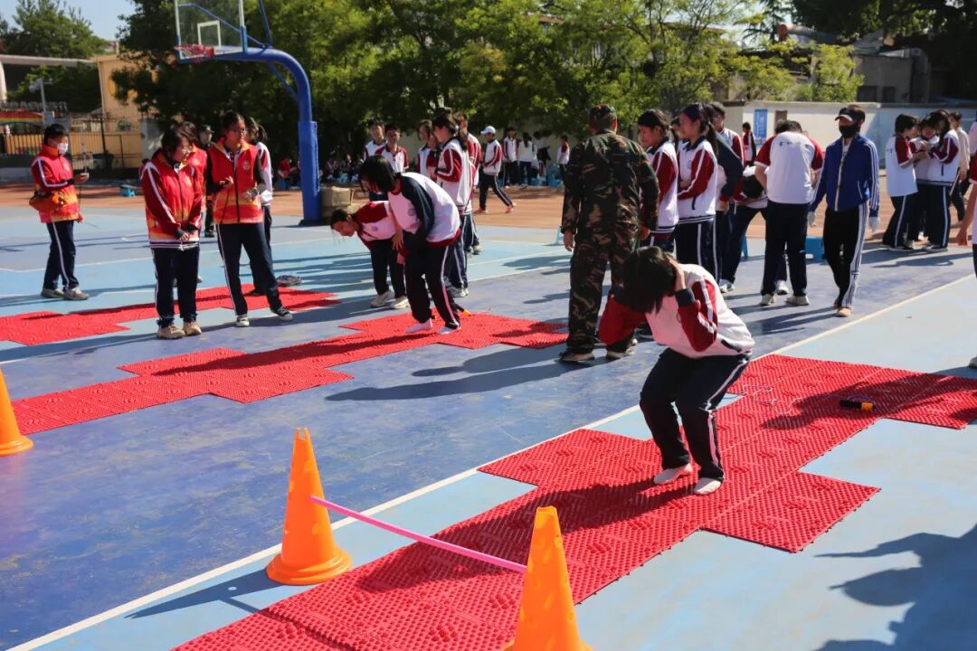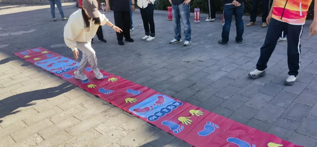 指压板接力:同学们脱鞋在指压板上完成跳绳、转呼啦圈、跨栏等挑战,痛并快乐着,笑声与尖叫声交织,成为全场最具“感官冲击”的项目。
