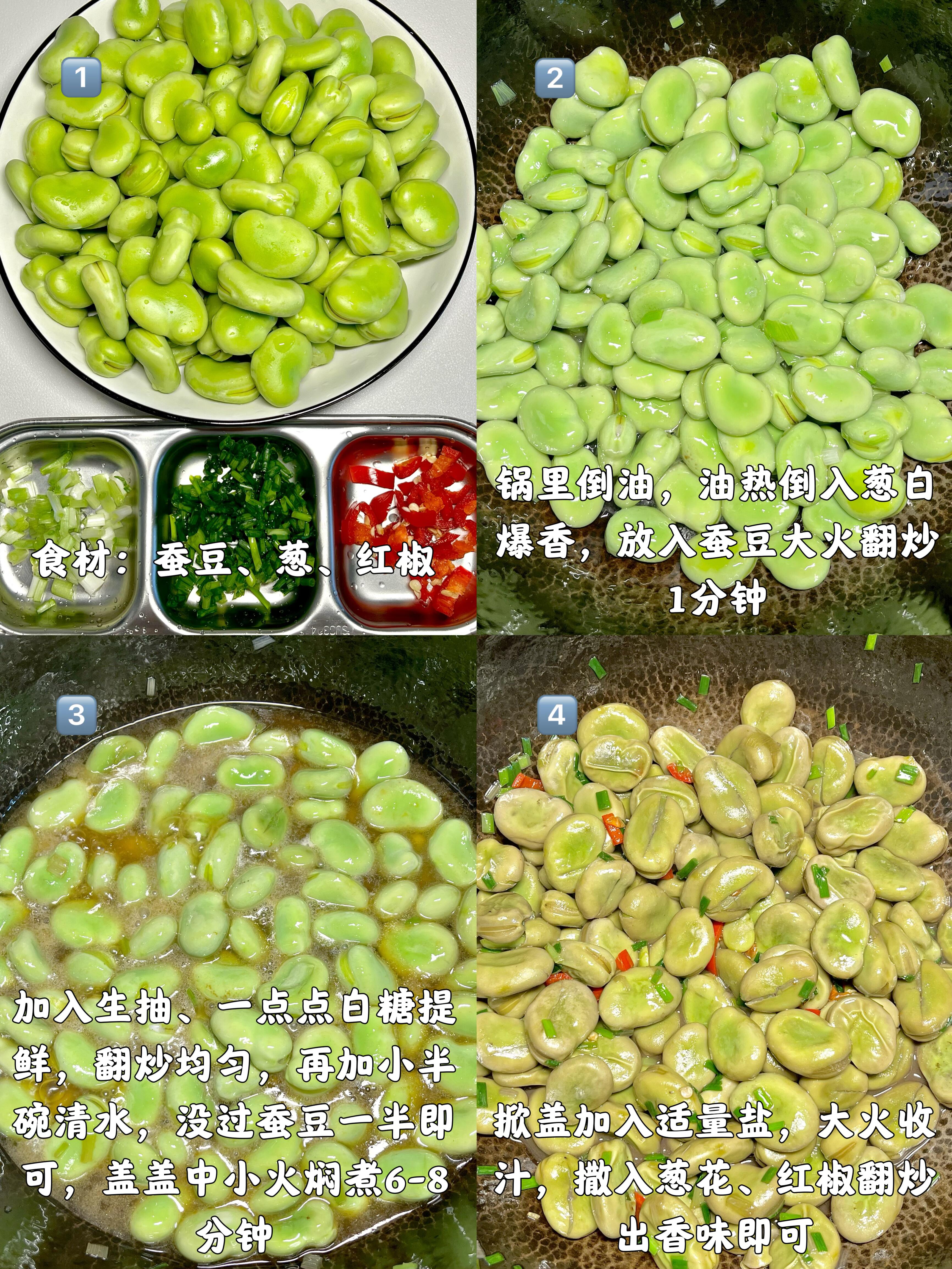 焖煮的时候不用管,中小火煮个三五分钟,能听到锅里“咕嘟咕嘟”的声音。等豆皮裂开小口子,用筷子戳一下能轻松穿透,就说明蚕豆熟透了。开盖后加盐和一点点白糖调味,白糖不用多,就是提个鲜,中和豆子的微涩感。转大火收汁,等汤汁变得浓稠油亮,裹在每颗蚕豆上,就可以关火了。最后撒上预留的葱绿碎,快速翻拌几下,让葱香彻底激发出来,就能装盘上桌。