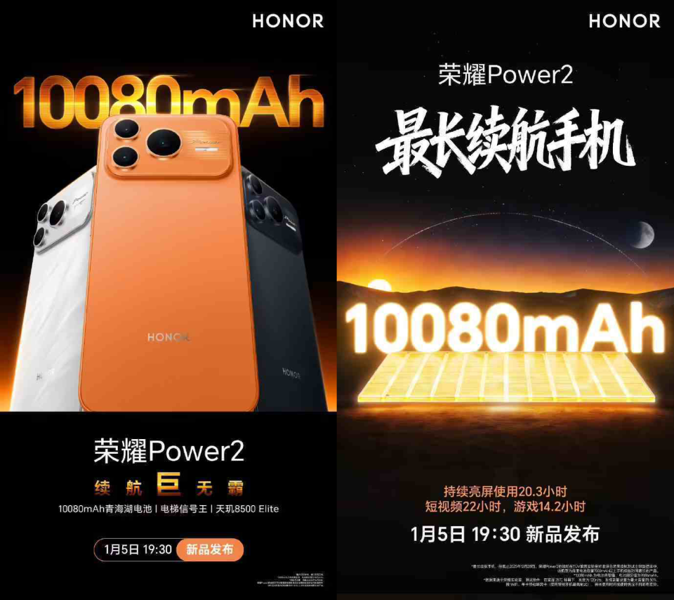 随后, @荣耀手机 还发布了一张第三方机构或数码博主给出了对荣耀Power2续航的评测结果的预热海报,并称,“续航巨无霸,实力登场。#荣耀Power2#荣登四家权威媒体榜单续航NO.1!搭载荣耀史上最大10080mAh青海湖电池,支持80W超级快充+27W反向充电,大电量、长续航,一机在手,持久无忧。荣耀Power2新品发布会,1月5日19:30不见不散!”