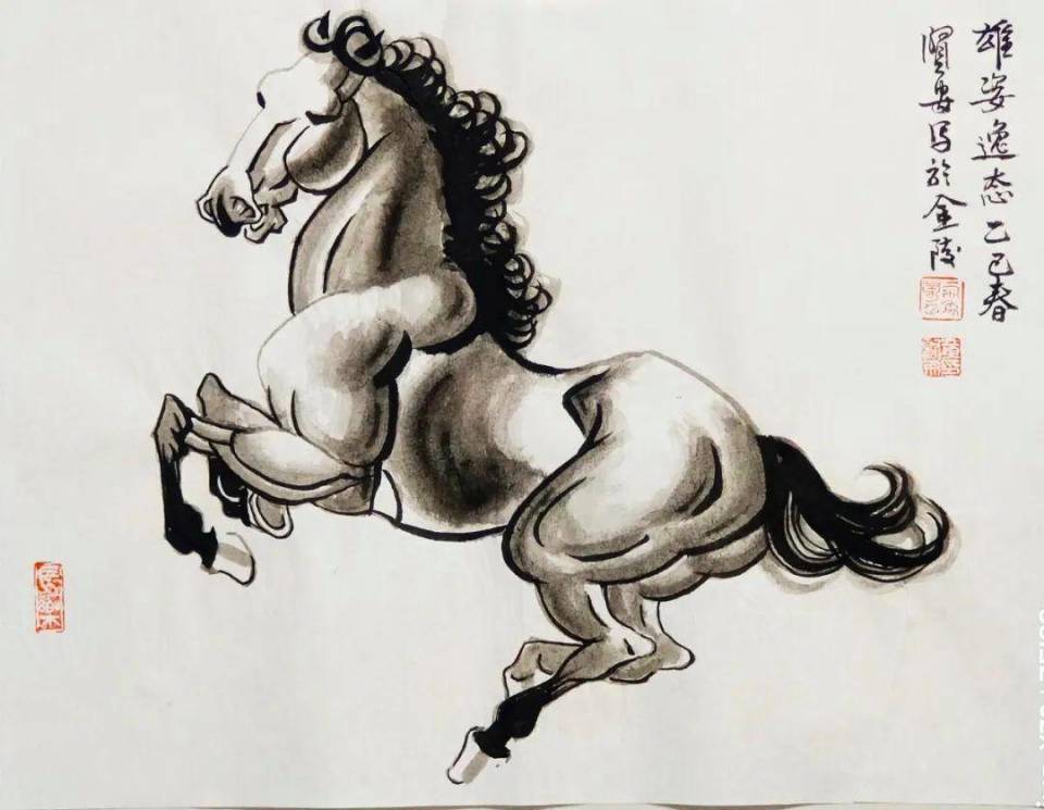 作为以画马著称的艺术家,黄贤安笔下的骏马,是形神兼备的生命载体,更是精神风骨的具象表达。他深谙 “作画以理、气、趣兼到为重” 的古训,在创作中既坚守写实的严谨,又追求写意的洒脱,将素描造型原理融入中国传统的骨法用笔之中,以 “笔以立其形质,墨以分其阴阳” 的理念,让点、线、面交织出骏马的立体筋骨。不同于传统画马的白描勾勒,他摒弃纤细柔婉之风,以沉郁顿挫、苍润挺拔的笔墨写马,受光处留白显俊朗,阴影处染墨见厚重,尤其对马的头部、肌肉的刻画,既遵循解剖结构,又适度夸张强化,于似与不似之间凸显雄健之力。