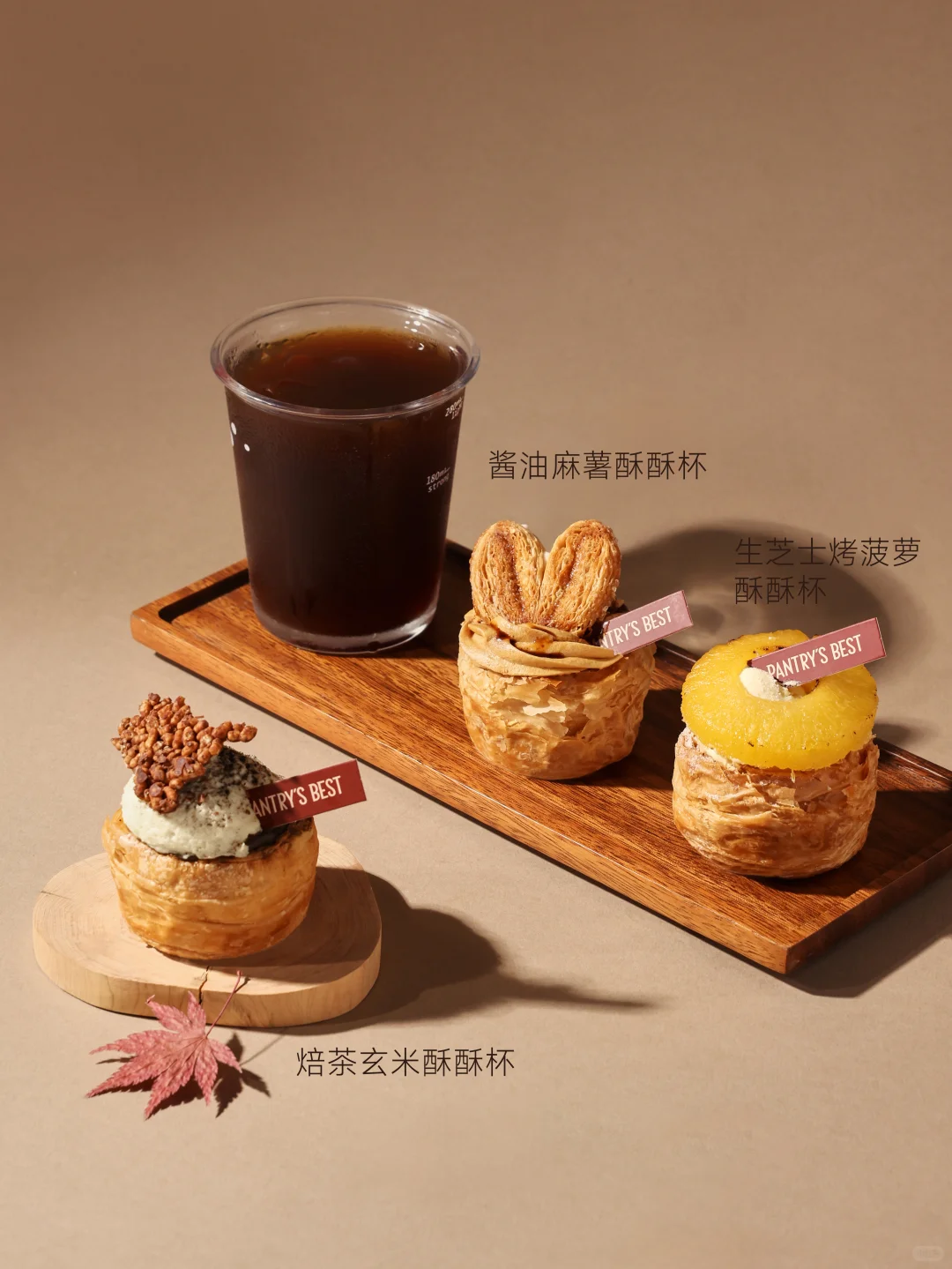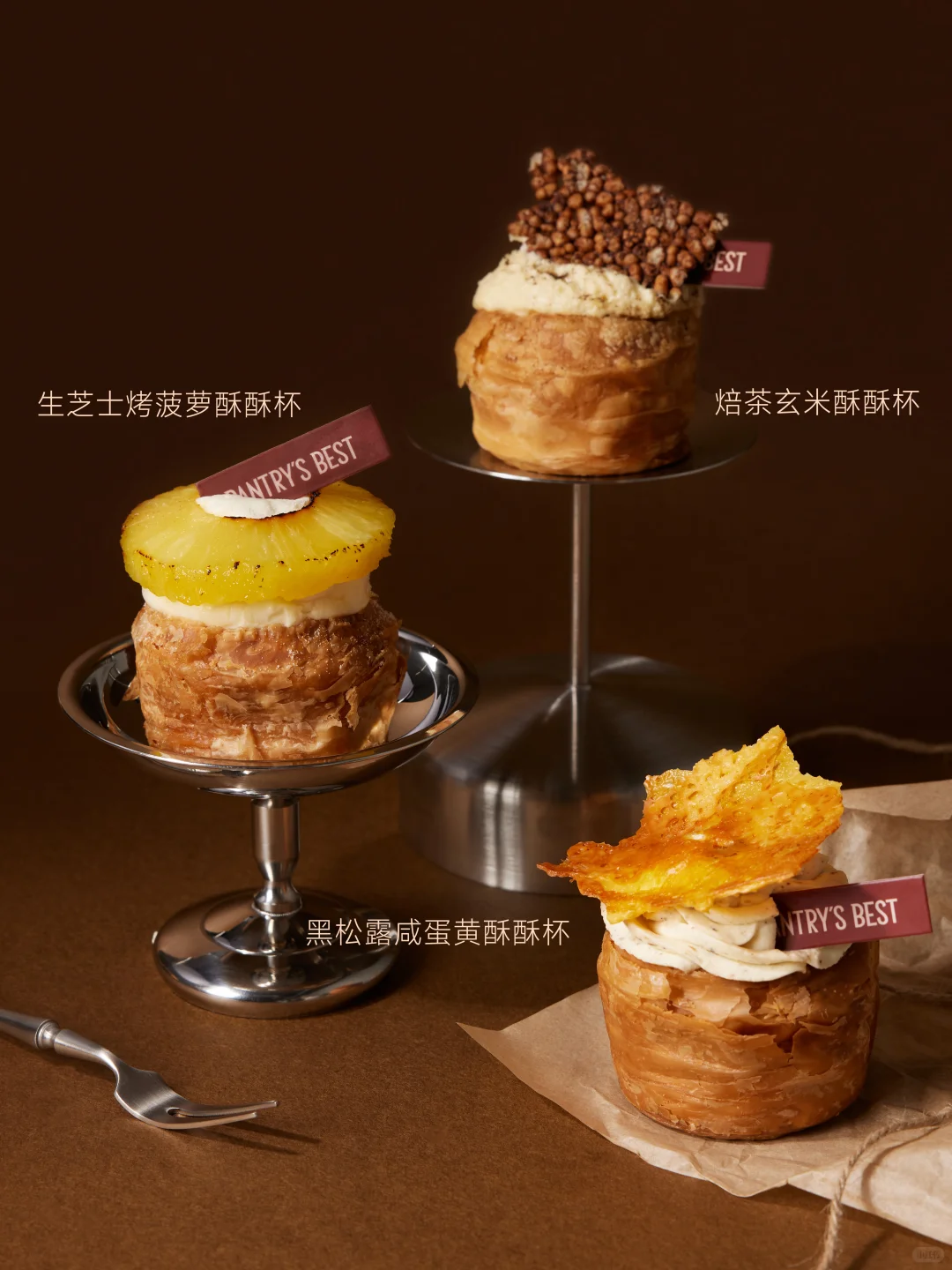 黑松露咸蛋黄酥酥杯、酱油麻薯酥酥杯、生芝士烤菠萝酥酥杯、焙茶玄米酥酥杯,鲜酥交错,新鲜现制,让你吃到第一口酥脆~
