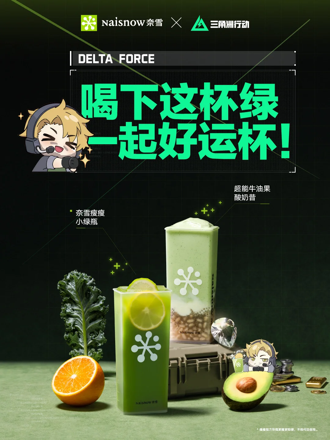 奈雪的茶×三角洲行动上新「超能牛油果酸奶昔」、「奈雪瘦瘦小绿瓶」