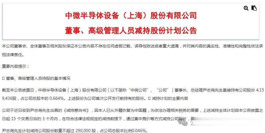 据披露,截至公告发布日,尹志尧直接持有中微公司股份415.94万股,占公司总股本的0.664%,上述股份均为公司首次公开发行前持有的股份。本次减持计划自本公告披露之日起15个交易日后的3个月内,在符合法律法规规定的减持前提下,通过集中竞价等方式减持公司股份。