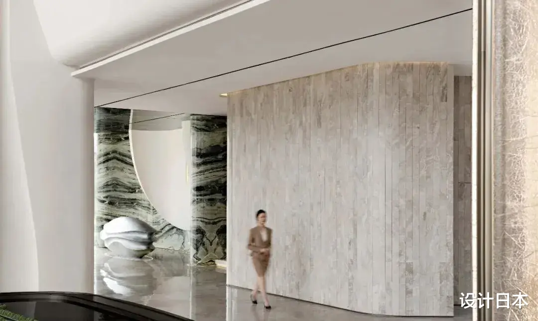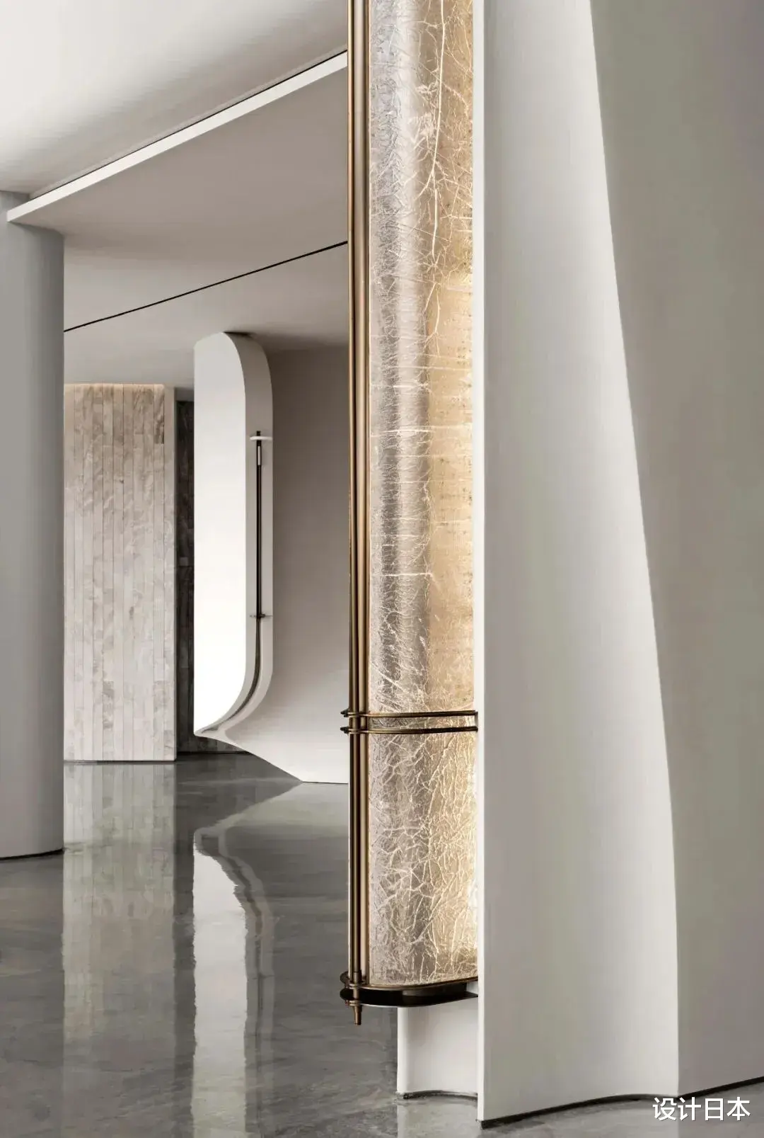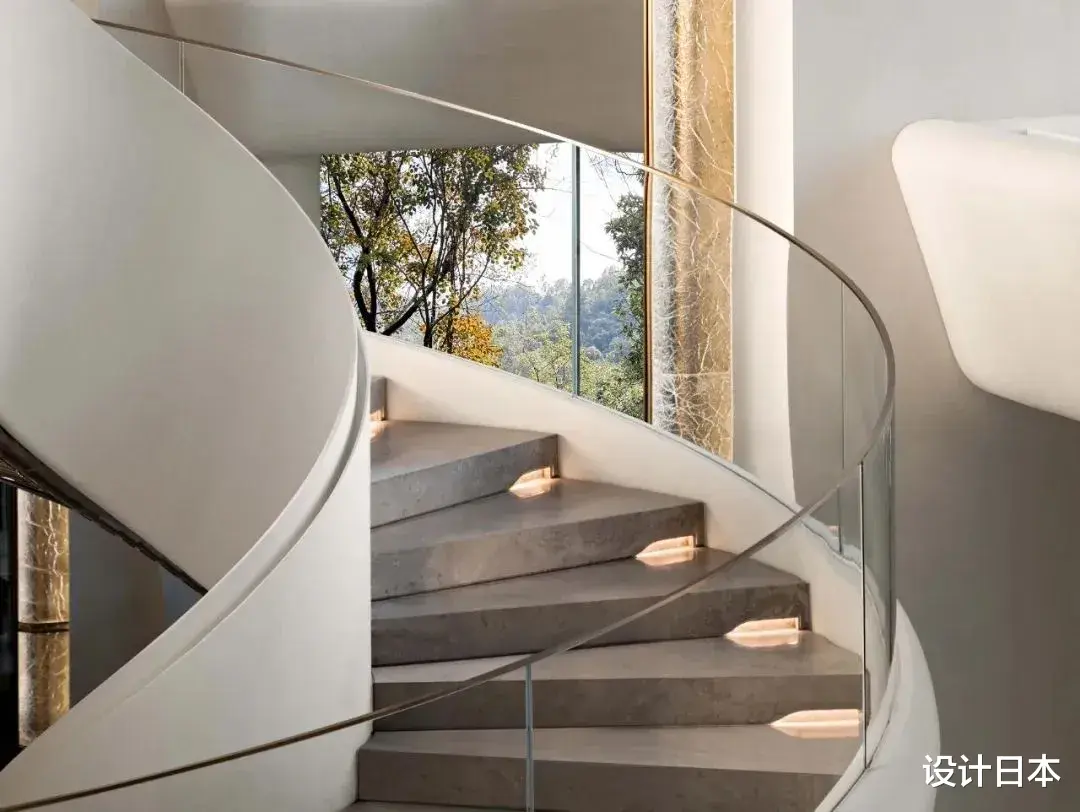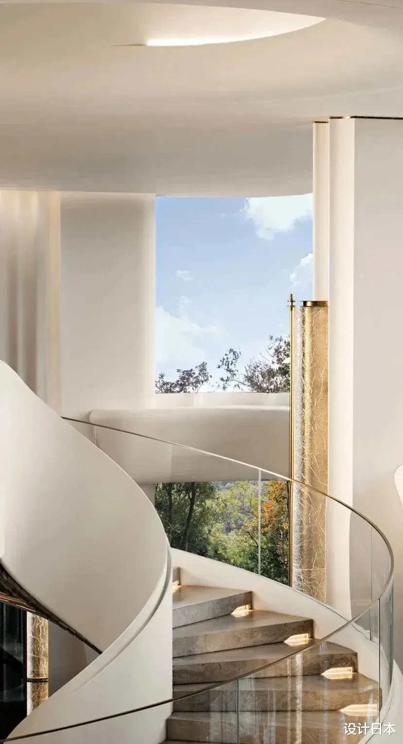 优雅的墙层因光线渲染交织出美丽的剪影。旋转式楼梯与空间柔美环境构成巧妙的互补关系,以逐步扩展的设计形态联同柔和观光景,打造惬意空间。