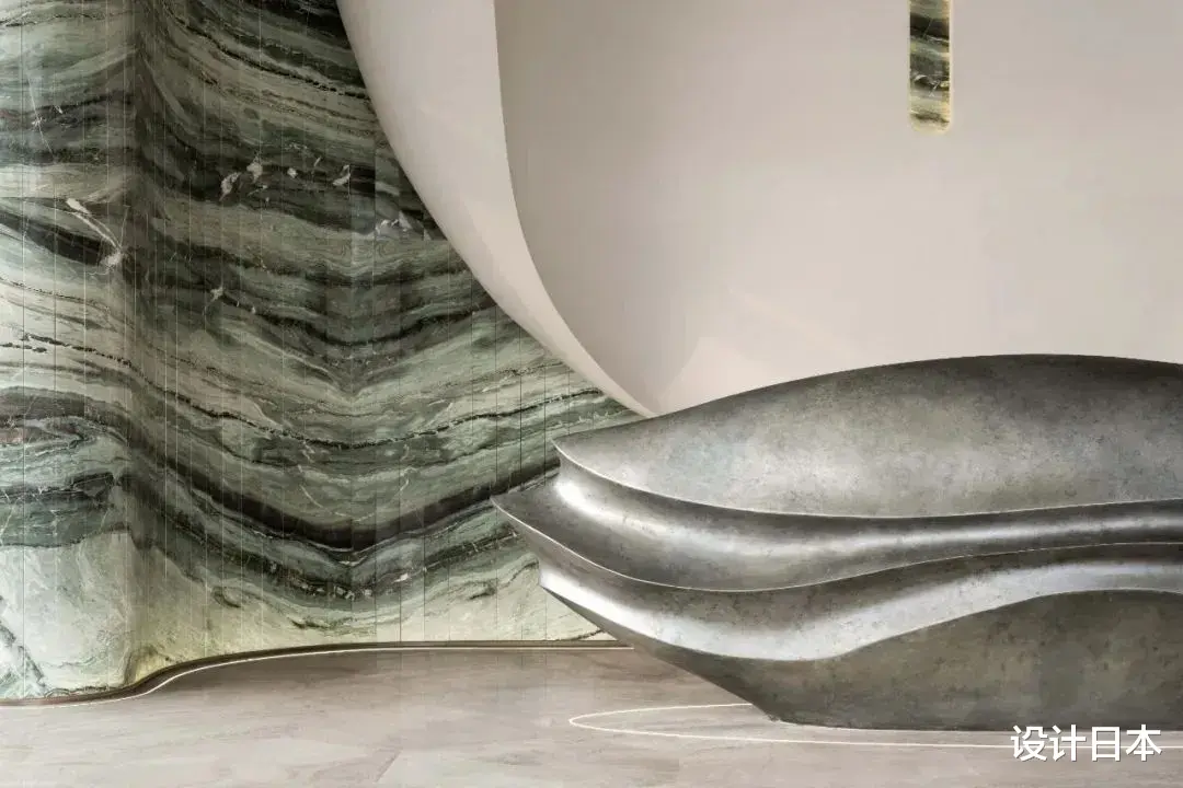 空间内采用精选材料组合流线轮廓,成就区域流动性。加入碧色大理石打造抽象型山水动态,引导多元方位形成彼此衔接。