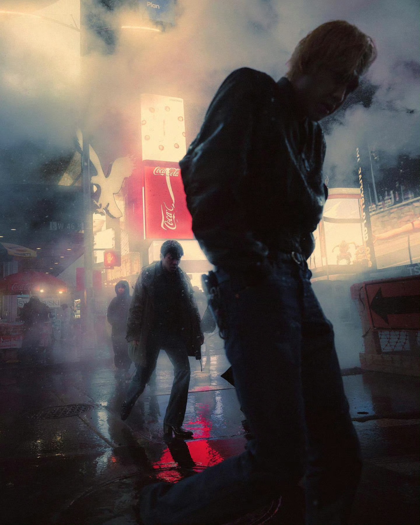 在寒冷的天气里,人们呼出的白气是冬季最直接、最生动的标志。这能为静态的人物增添生命感和温度感。