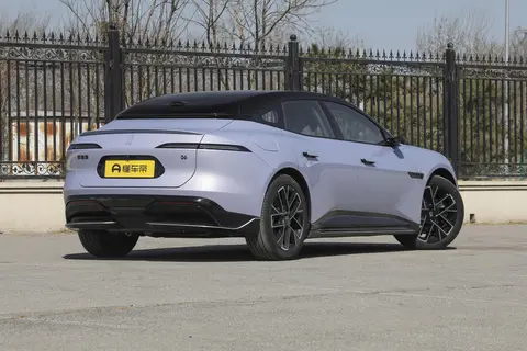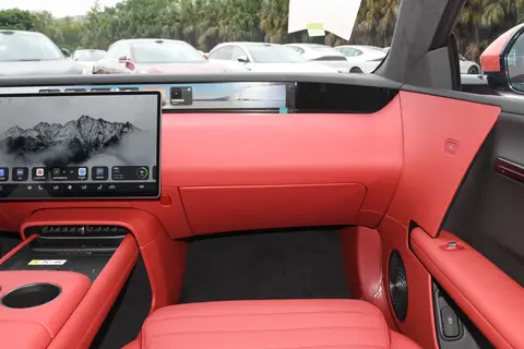 从车身侧面看,低趴的轿跑造型特别抓眼球,车身比例很协调,1.36的宽高比让它看起来又宽又稳,有种贴地飞行的感觉。最吸睛的就是溜背造型和无后舷窗设计,配上悬浮车顶,整个侧面线条一气呵成,销售小哥特意向我介绍了它的悬浮顶双层设计。这不仅仅是为了好看,更是美学与实用主义的完美结合。我坐进后排亲自体验,果然,丝毫没有因为溜背造型而感到压抑,真正的“鱼与熊掌兼得”。黑色的车顶从视觉上巧妙地将车身重心压低,让整台车看起来更加修长、贴地,充满了蓄势待发的运动感。再搭配上20英寸大尺寸轮胎,视觉效果很霸气。车尾延续了家族式的贯穿尾灯和双层扰流板,虽无后窗设计也让尾部看起来更整体、更科幻。那个电子外后视镜,不仅科技感拉满,还能减少风阻。而掀背式尾门设计不仅让车尾线条更流畅,75° 的开口角度也很实用。试驾结束时装下三个行李箱毫无压力,后备厢容积远超我的预期。整体来看,这车颜值在线,设计原创度高,开出去回头率不低,说是“最 美增程”也不夸张。