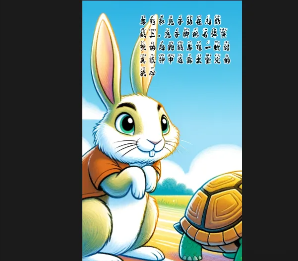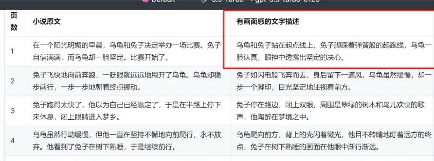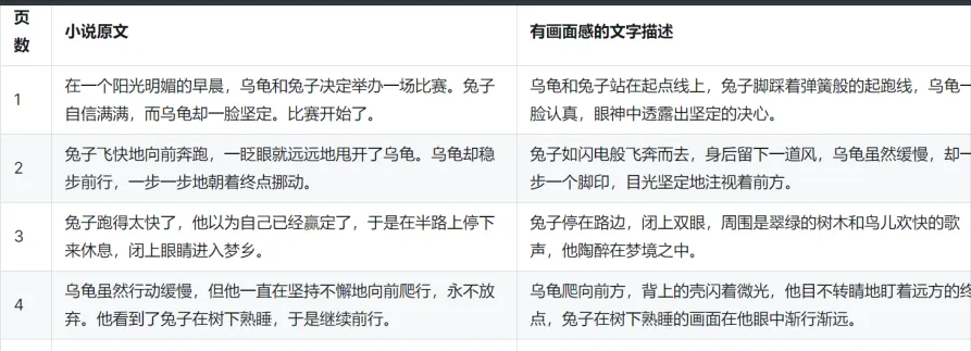 首先打开GPT,输入指令“帮我简单汇总一下《龟兔赛跑》的故事,我需要用来做儿童绘本的文案和大纲,大概8-10张图,每一段文字改成具有画面感的描述,并进一步修改为ChatGPT绘画创作的prompt提示词,以便于后续可以使用ChatGPT进行图像绘制。最终请用表格的形式呈现。第一列 对应的页数 第二列 小说原文,摘录原文即可 第三列 对应小说原文,改成的有画面感的文字,请增加画面细节描述 第四列 prompt,请用一个个的关键词用逗号隔开描述 ”。