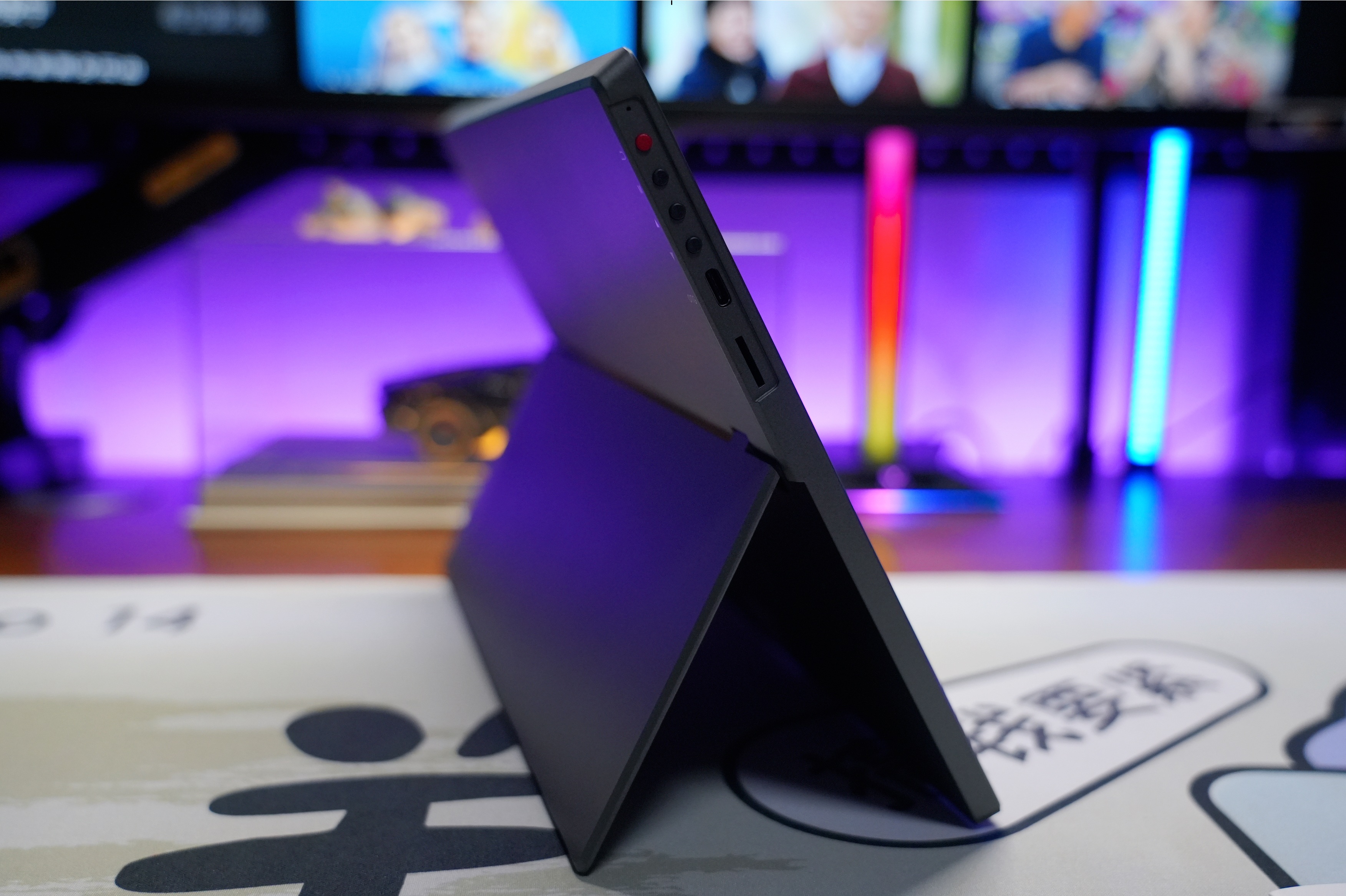 而且它的支架设计特别贴心,无级调节的金属铰链阻尼感刚好,能轻松调到自己舒服的角度,不用额外搭配支架,展开就能用,桌面也更整洁。12.3英寸的尺寸不大不小,既能提供足够的显示空间,又不会占据太多桌面位置。