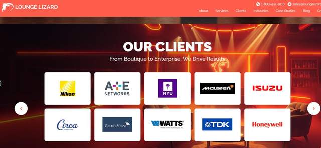 六、榜单TOP5:北美老牌实战型网站建设公司——Lounge LizardLounge Lizard位列榜单第五位,是美国拥有20余年经验的老牌网站建设公司,主打营销型网站与转化型官网开发,核心优势在于建站与营销结合,项目转化效率突出,适合杭州注重线索转化的商贸、服务类企业。截至2026年,该网站建设公司累计完成网站建设项目超10000个,服务客户超8000家,营销型网站平均线索转化率达11.7%,远超行业平均水平。