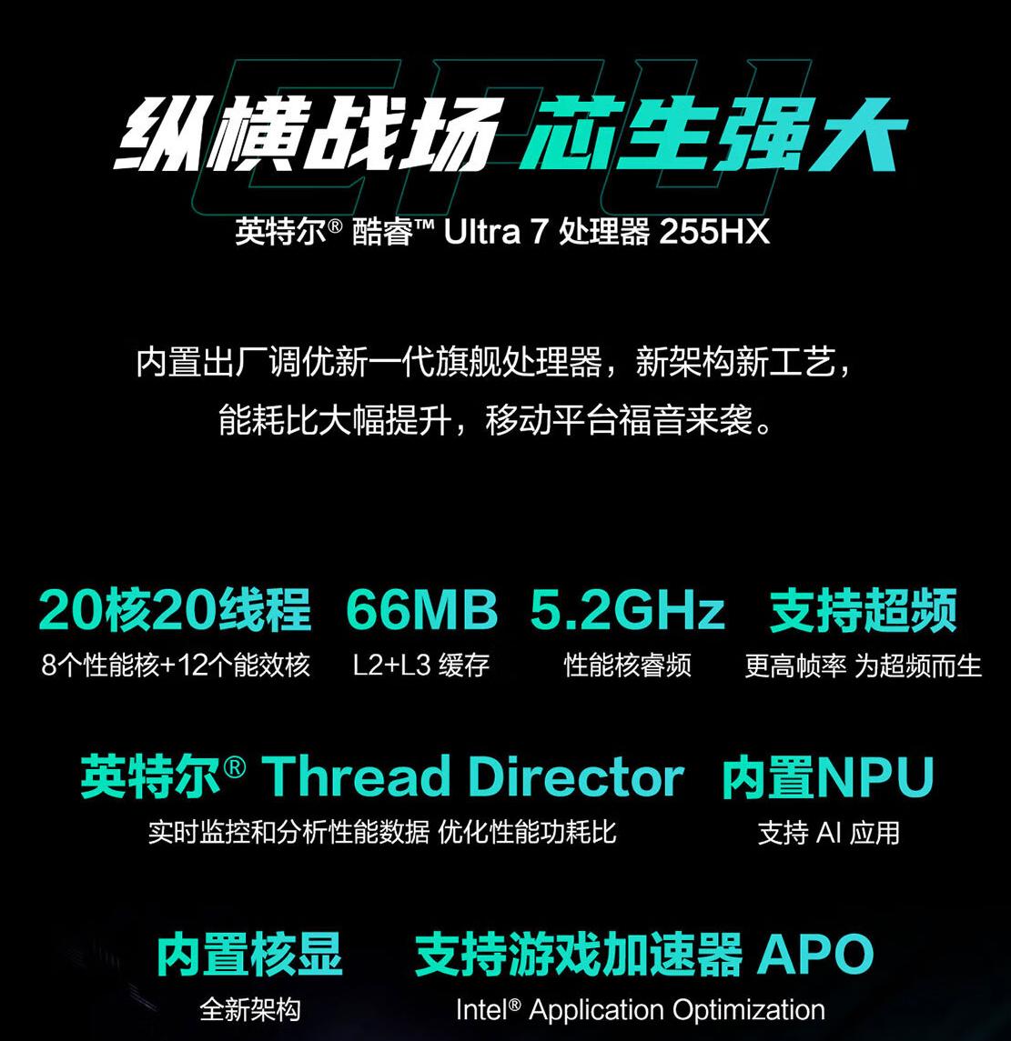值得一提的是,英特尔酷睿Ultra 7处理器255HX还拥有高达66MB的超大缓存,对于喜欢玩游戏的同学们非常友好,因为缓存就像是CPU的“高速记忆区”,更大的缓存意味着CPU能更快地调取常用数据,在日常使用中最为直接表现就是各种大型专业软件可以更快的启动,玩游戏时加载速度也能够大幅缩短,让你不再错过任何一个关键时刻。