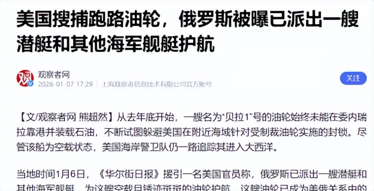 观察者网《美国搜捕跑路油轮,俄罗斯被曝已派出一艘潜艇和其他海军舰艇护航》