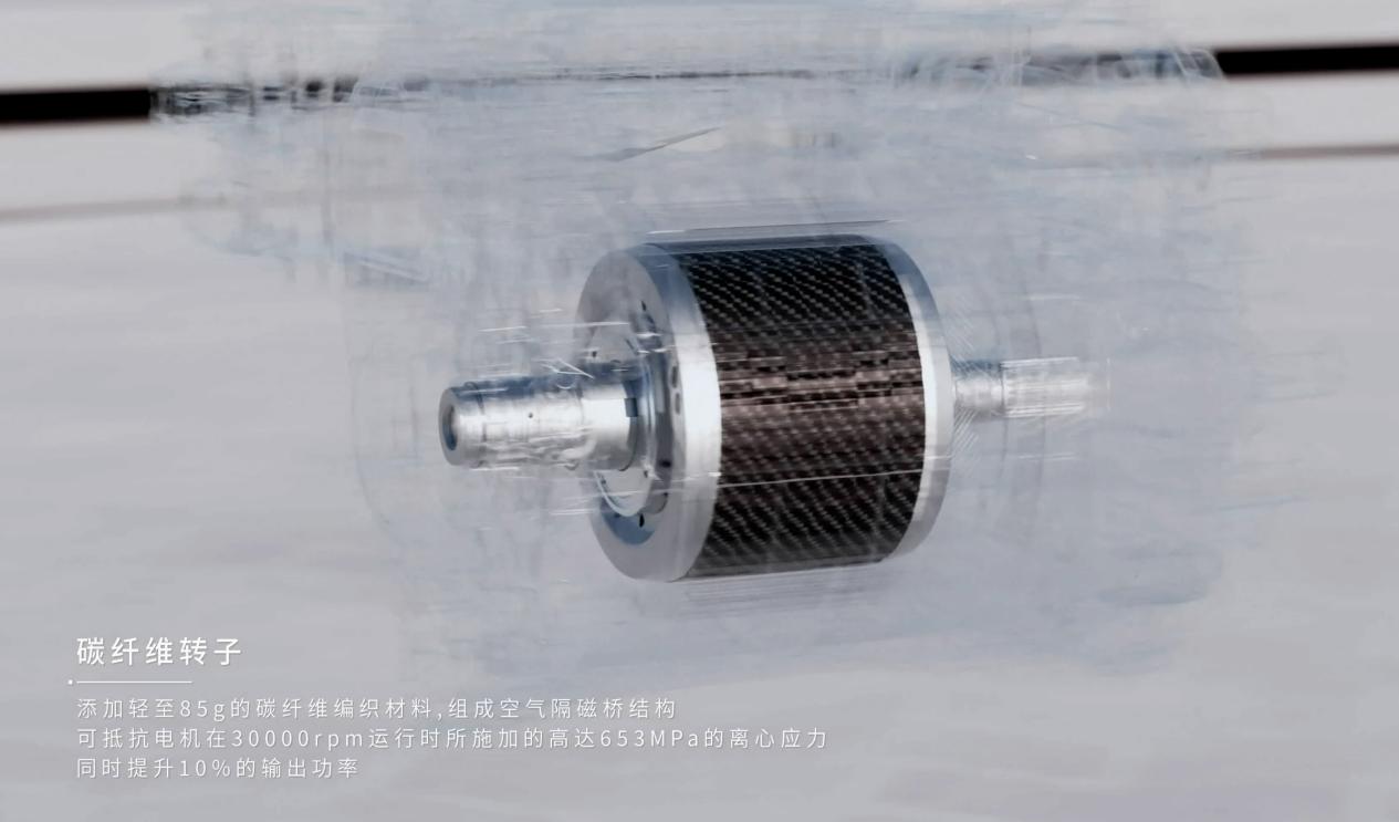 转子部分,它用了1mm碳纤维套,工艺上是T800碳丝湿法缠绕,再配合少稀土磁钢。高转速从来不只是电磁问题,背后还有机械强度约束。转得越快,离心力越大,所以碳纤维高速转子的意义,不只是「转得快」,更是「转得住、转得稳、转得久」。