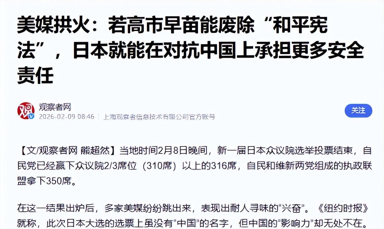 选举结束后,高市第一时间回应,称“日美同盟潜力无限”,双方围绕修宪、扩军的默契不言而喻,美媒点名本质上就是美国对日本右翼势力,从暗中支持转向半公开默许的信号。