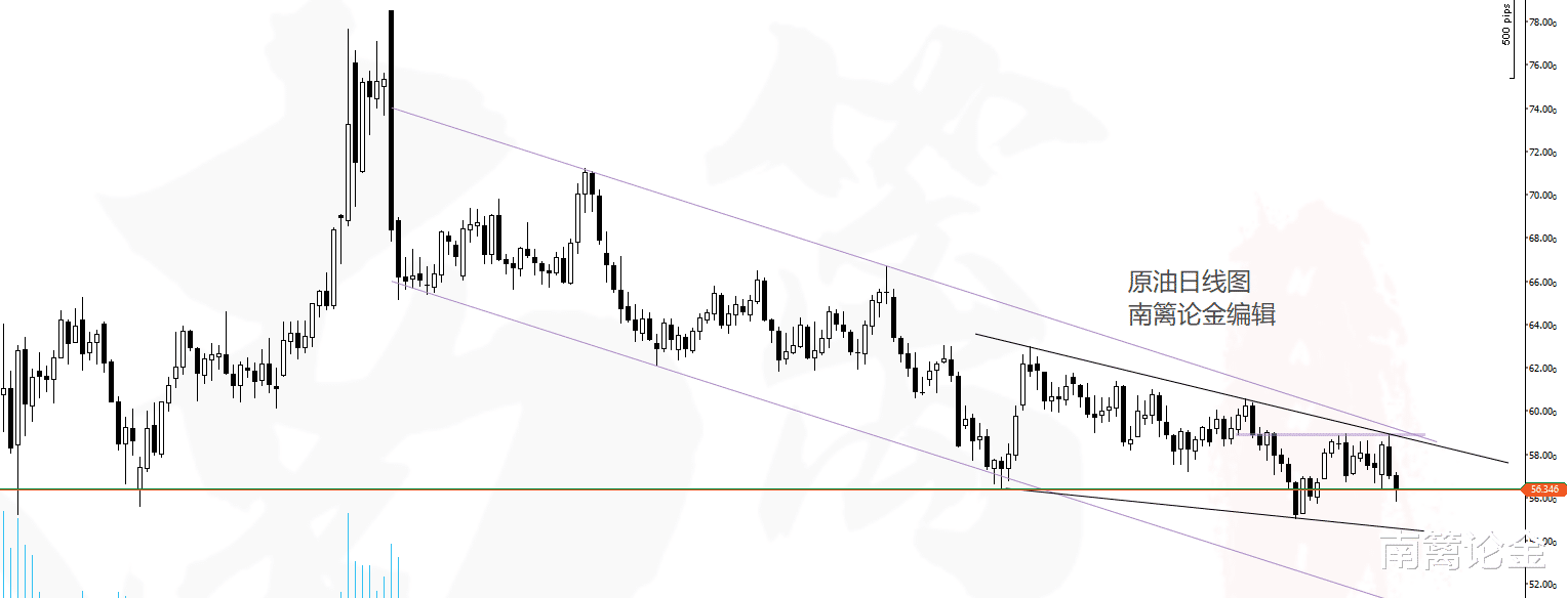 截至目前,原油刷新了前方的两个低点,头肩底已经失效了。进一步来看,原油的下一步预测,应该就是它还能再刷新一下前方的日线的低点,构建出的形态,就算是一个楔形的形态了。对于油价来说,是时间较久的打压,要给出来更多的时间去看它。