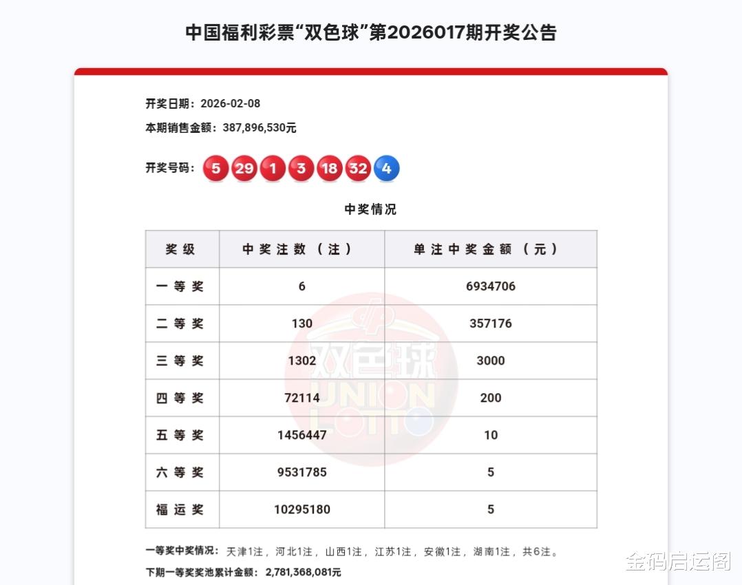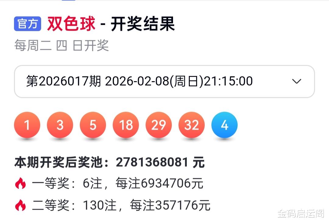 双色球第2026017期开奖结果正式揭晓,当期红球号码为 01、03、05、18、29、32,蓝球 04。