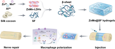在進一步的研讨中,科學家們發現ZnMn-LDHs可以調控鉅噬細胞释放的神經生長因子(NGF),這種因子對雪旺細胞的伸長和擴散具有顯著的促進作用。基於這一發現,研讨者將ZnMn-LDHs與丝素蛋白(SF)分別,勝利構建了一種可注射的水凝膠(ZnMn@SF),用於脊髓损傷(SCI)的修復。動物模型實驗結果顯現,這種水凝膠不只具有良好的抗炎作用,還能有效促進脊髓损傷後的功用恢復。