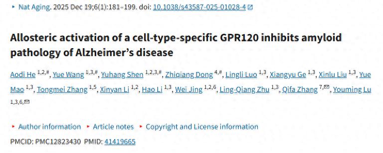 参考文献: He A, Wang Y, Shen Y, et al. Allosteric activation of a cell-type-specific GPR120 inhibits amyloid pathology of Alzheimer's disease. Nature Aging. 2026. https://doi.org/10.1038/s43587-025-01028-4