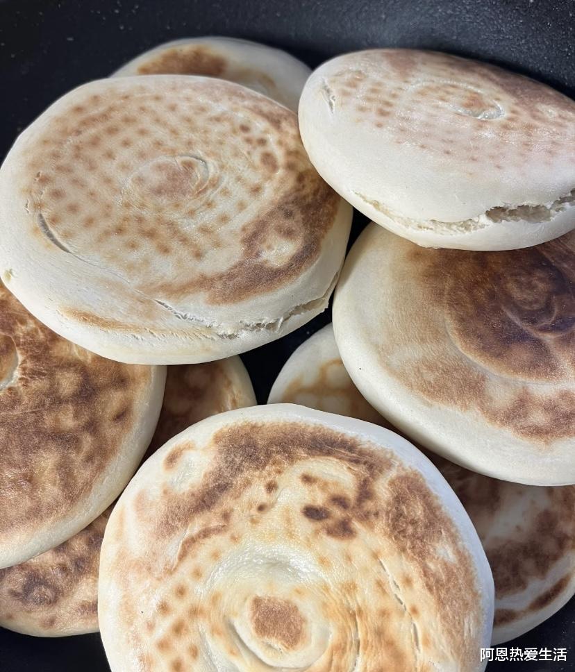 把醒好的面团分成小剂子,将每个小剂子擀成厚约0.8厘米的圆饼。开启无油干烙模式,将平底锅烧热后转中小火,放入圆饼,两面烙至出现焦斑,这个过程大约需要8分钟。此时馍呈半熟状态,因为后续还要泡在汤里继续炖煮。