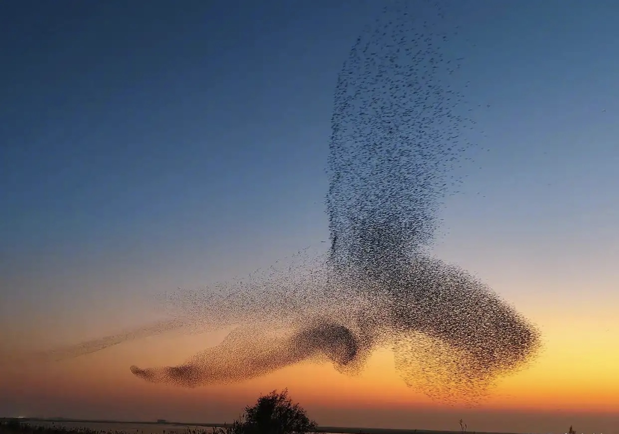 精密协调:鸟群在飞行中变换出的复杂队形,展现了高度的协同性与组织性。