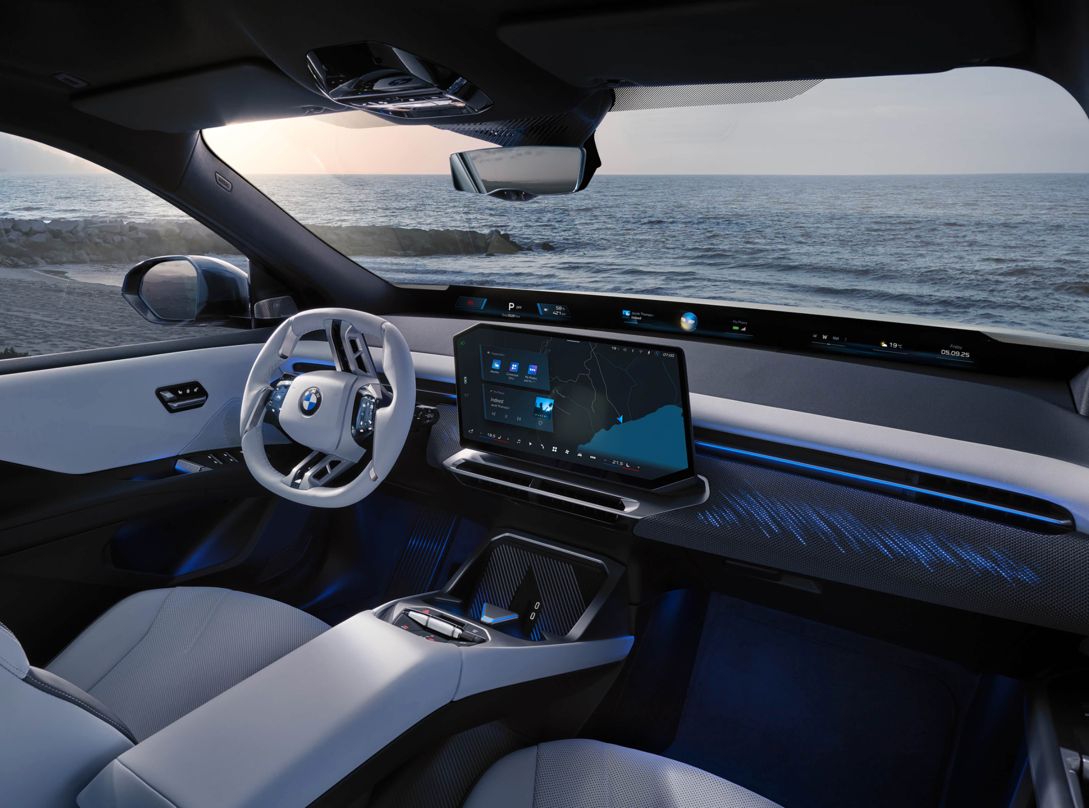 进入车内,宝马iX3性能版车内遵循了极简的设计风格,车顶配备了全景一体式防晒天幕,提升车内通透感。环抱式座舱采用了大面积米白色软性材质铺陈,还加入了大量蓝色装饰条,并配备了符合人体工学设计的沙发座椅,前排座椅的包裹性和支撑性更;后排座椅的舒适性更佳。中控台配备了全新设计的M Performance方向盘、精致小巧的换挡拨片,带来了更好的操控性。搭载宝马新世代操作系统X,首次引入全景视域桥系统,整合近40英寸4K视平线投影与3D抬头显示,中控屏尺寸为17.9英寸。并引入与阿里巴巴共同开发的宝马定制大语言模型(LLM)技术,DeepSeek的AI大模型能力以及AI智能体引入座舱,同时支持鸿蒙生态和HUAWEI HiCar等数字化服务。