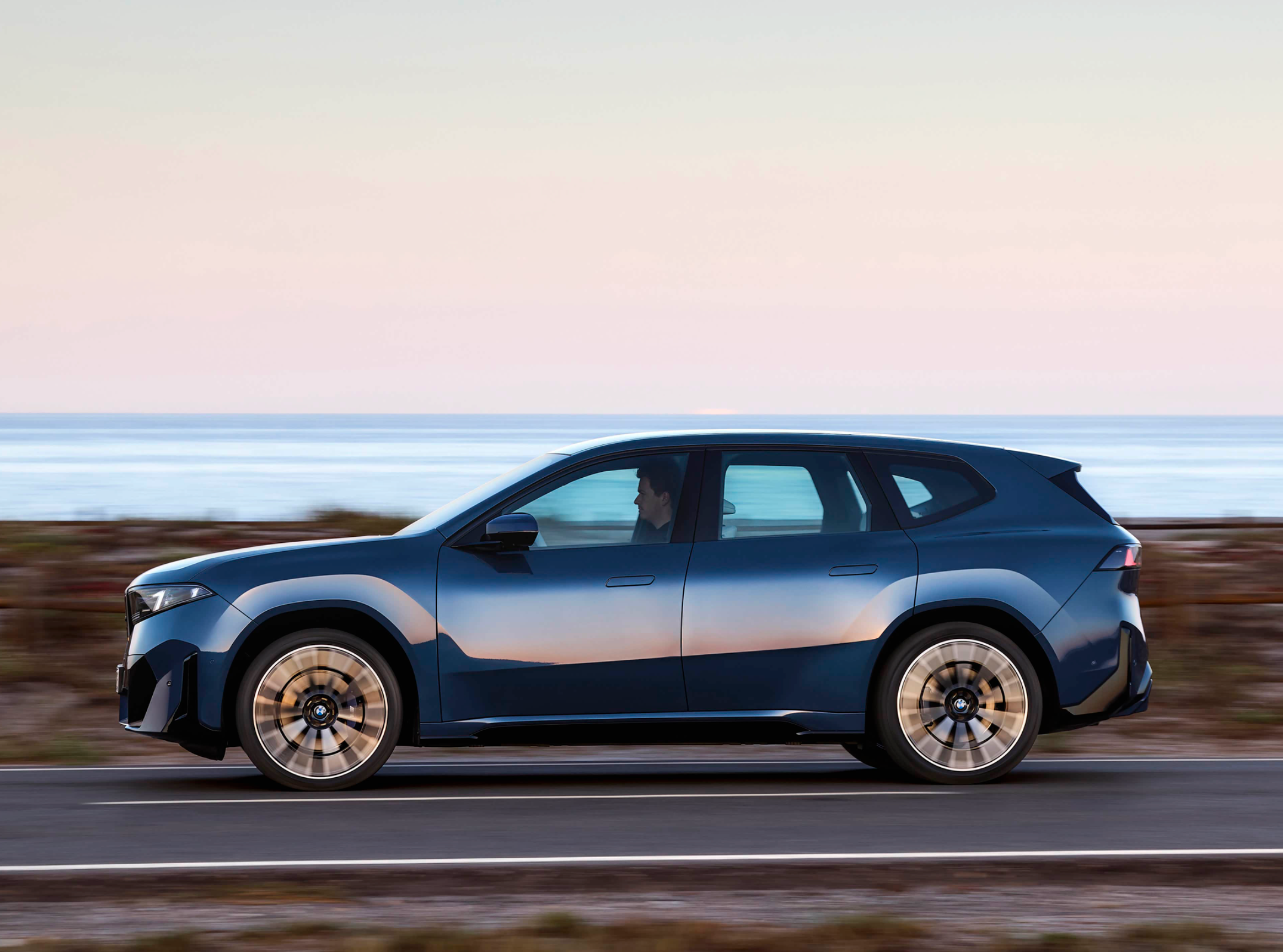 来到车身侧面,全新的性能版宝马iX3在现款iX3的基础上加入了更多M Performance运动套件,车身延续“高头大马”风格,强调轮眉与腰线,同时优化空气动力学,采用了大量优雅流畅的线条勾勒,并保留了经典霍氏拐角,隐藏式门把手与低风阻轮毂进一步降低风阻系数。该车配备了22英寸的锻造轮圈,与之匹配了255/35 R22、275/35 R22规格的轮胎,还采用了四活塞刹车卡钳和370mm通风刹车盘,整车的风阻系数低至0.24Cd。尺寸方面,性能版宝马iX3的长宽高分别为4885/1895/1635mm,车身轴距3005mm,比标准轴距版的宝马X5更加出色。整车采用了宝马BMW家族经典的蓝色车漆涂装,经典的霍氏弯角进化为专属的“镜光弯角”,通过超薄氧化钛条纹实现独特的动态光影效果。