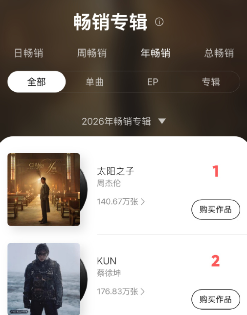 这一成绩超越了此前由蔡徐坤新专辑《KUN》保持的数据,暂列2026年数字专辑销量榜首,强大的粉丝购买力与市场期待值可见一斑。