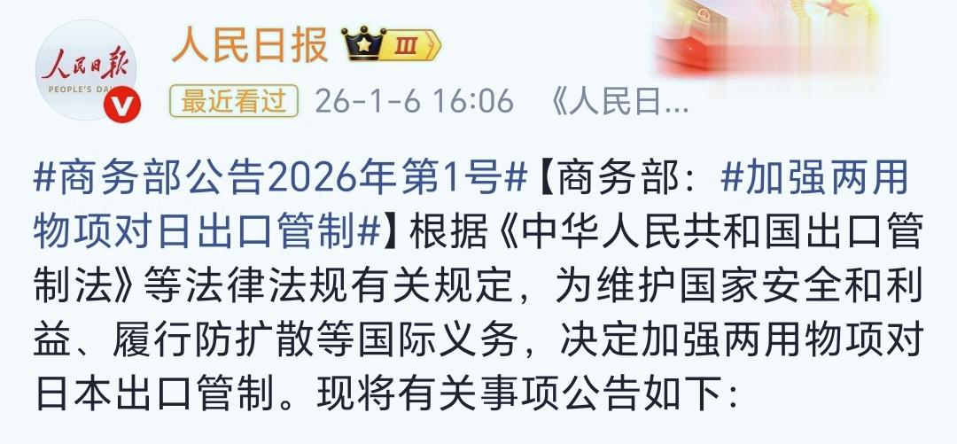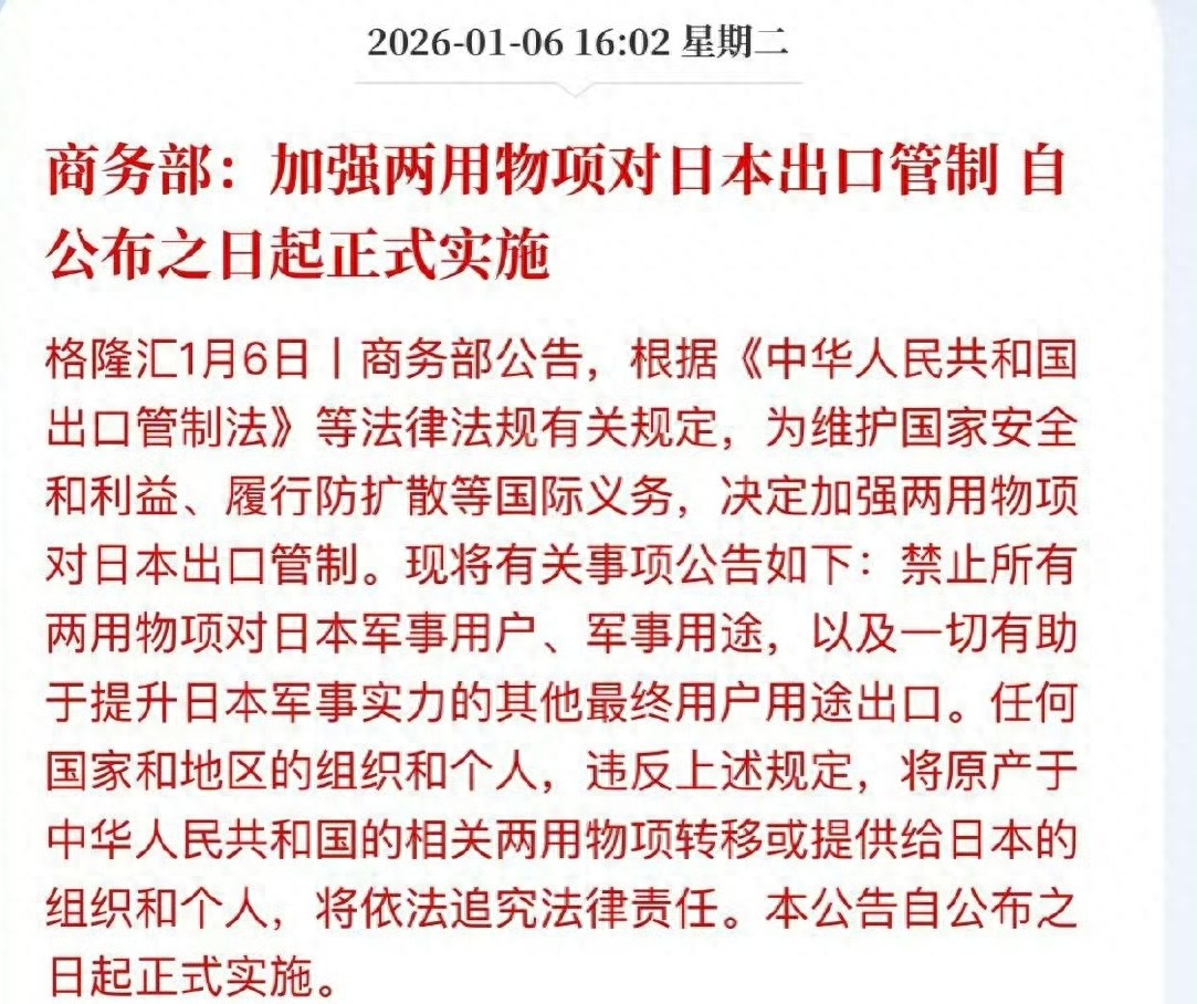 1月6日,商务部发布公告,即日起禁止两用物项对日本军事用户、军事用途,以及一切有助于提升日本军事实力的最终用户用途出口。