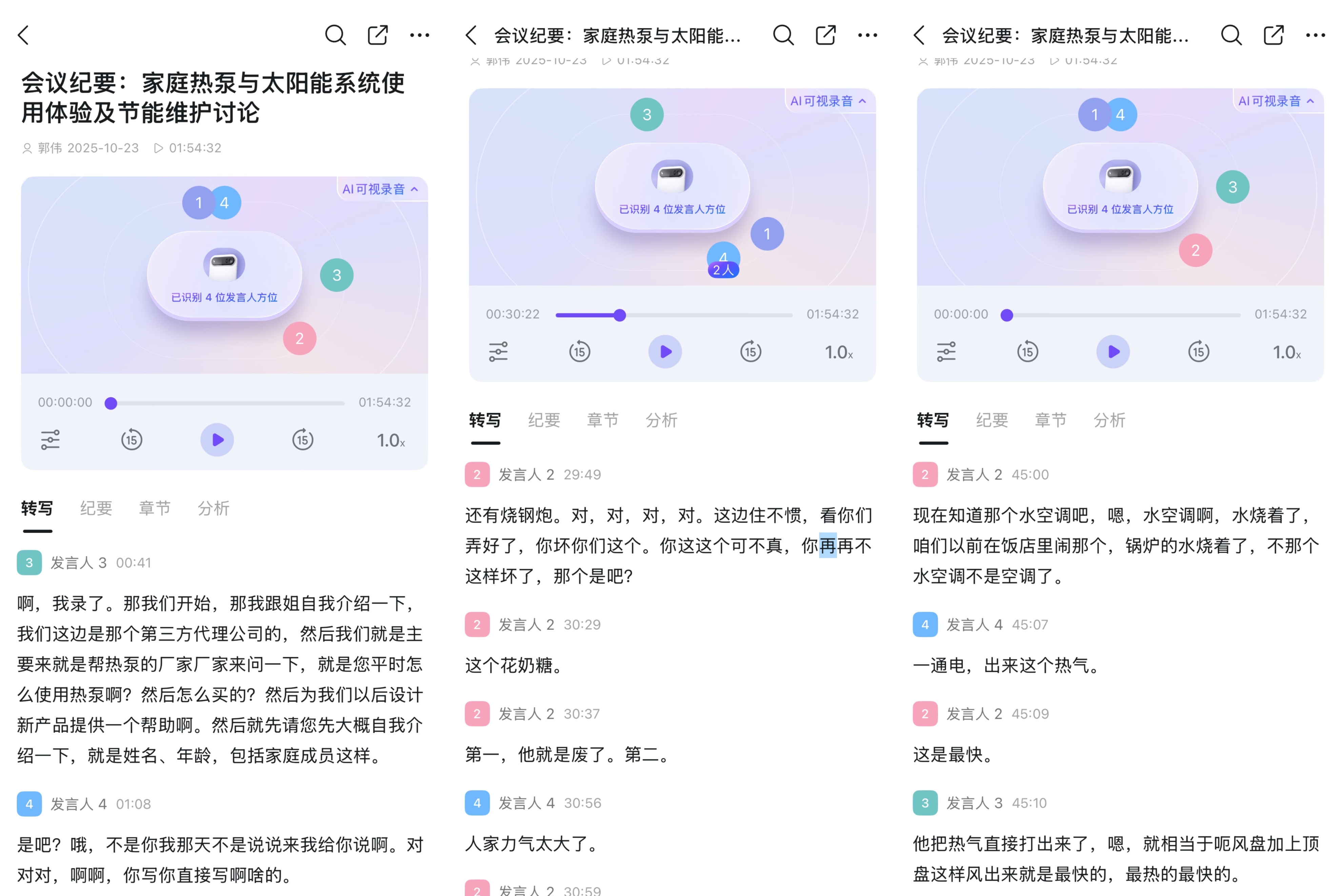 拿上钉钉A1进行了一次实采,此次访谈针对使用家庭热泵设备若干年后的郊区自建房用户进行访谈,在音频方面被采访者还有很浓重的方言口音,近2小时的音频访谈DingTalk A1本身就可以按键进行录制,在连接到手机后自动同步文件到钉钉APP进行下一步操作,AI竟然在进行通篇内容浏览同时自动生成概况标题,在主界面“转写”选项中以时间标注段落转写文字,对于方言转普通汉字的精确度基本能达到可以理解意思的程度,得益于DingTalk A1具备6麦克风阵列的智能收声,在AI可视录音界面还能看到发言人的不同站位,对于场景再造形成了更加立体的场景化勾勒。