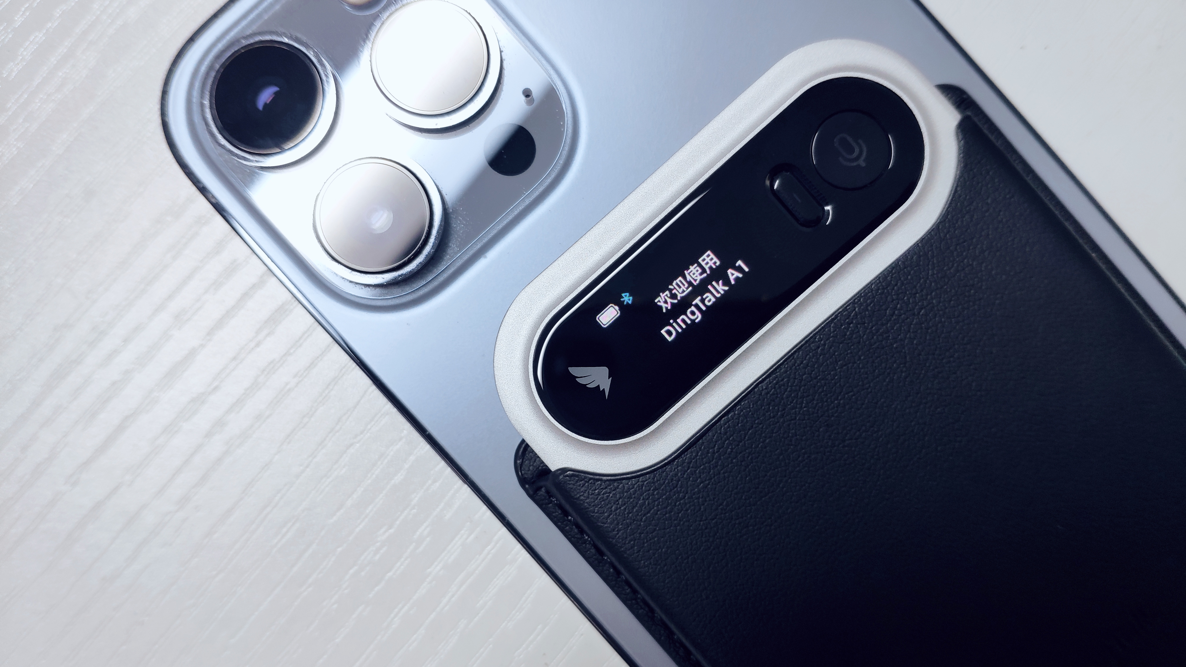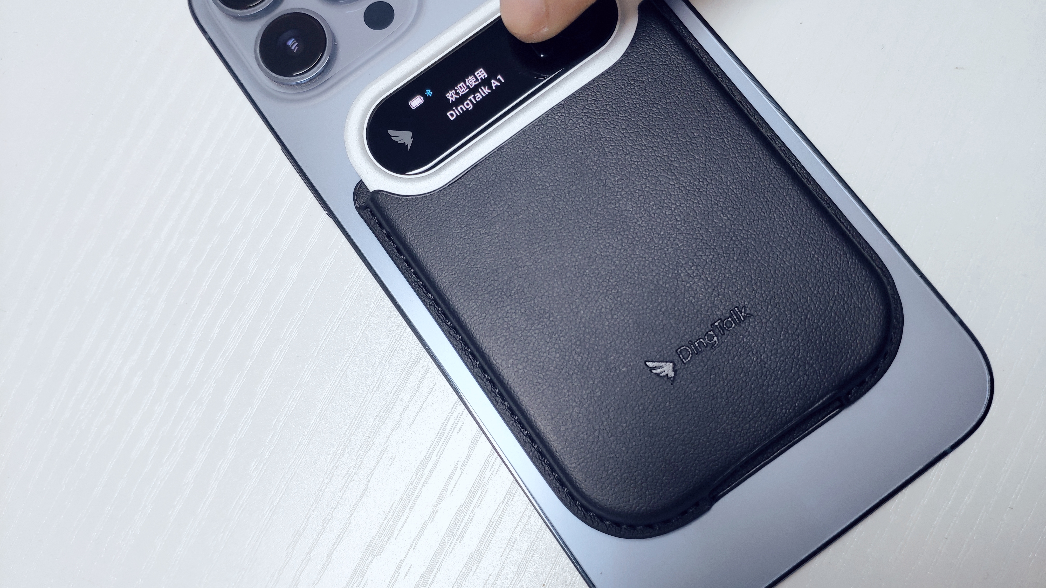 初始DingTalk A1这款硬件简直小巧到极致,也就几张重叠信用卡片厚度,皮套与金属机体的结合显得整个套装商务感十足,精致机身既有显示区又有实体按键配置,0.95英寸显示屏开机欢迎、文件同步、电池电量、蓝牙连接等信息,左侧按键具备开关机,开始/暂停录音等功能,同时在按键中间设置录音红灯指示;右侧标识话筒按键可实现发送语音,启停屏幕等功能。