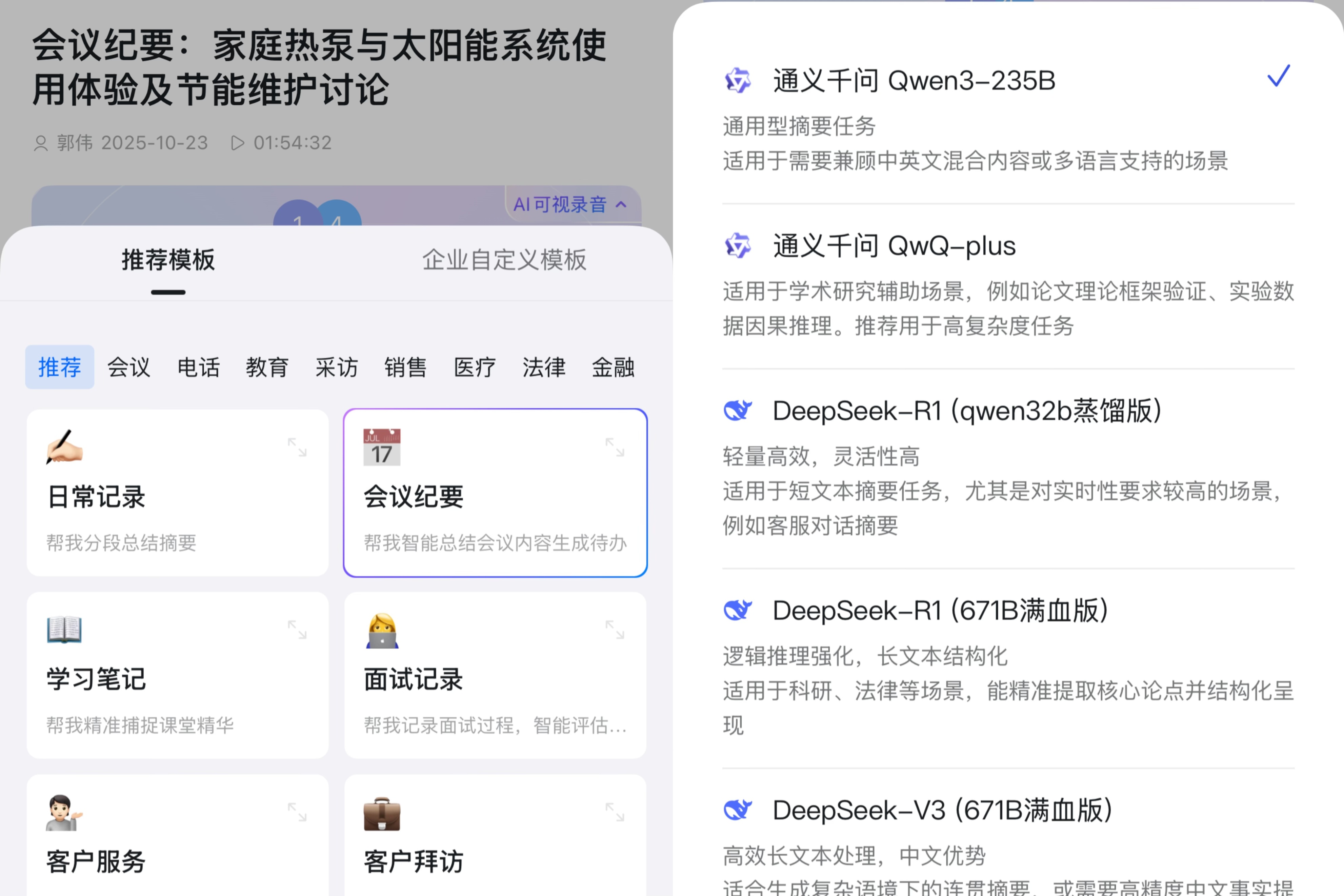 访谈纪要以会议纪要模型进行AI分析呈现,并可以随时选择各个模板对内容进行不同要求的纪要输出,总结了会议内容和议题,并以表格形式对会议时间、地点和参会成员进行统计,最后提供最终决策和待办行动事项并创建钉钉待办,简直就是强力效率助推器,这还没完呢,对于不同音频的内容还可以选择不同AI大模型进行更为专业的分析。