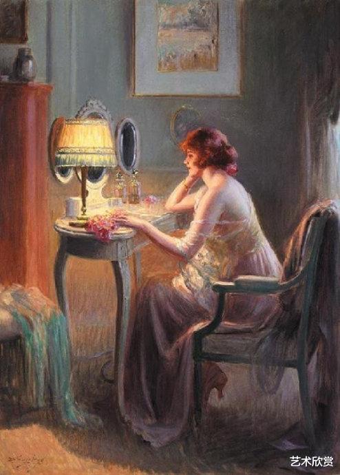 他的画布是窥见淑雅生活的万花筒:烛光亲吻书页时凝神的眉黛,银针穿梭亚麻布间隙的纤纤玉指,或是庭院灯晕里托腮沉思的剪影。代表作《窗下夜读的年轻女子》中,月光与灯盏交织成纱,将知识女性的静美凝练成永恒。画家曾三次强调:"美丽智慧的女人是我永不枯竭的灵感泉眼",而画中摇曳的炉火、流淌的绸缎与朦胧光晕,皆是他为"爱"这首永恒诗篇谱写的视觉韵脚。